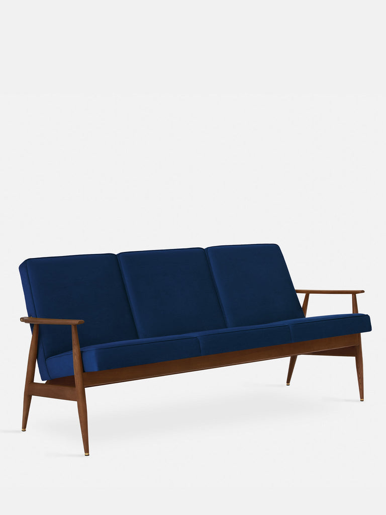 Bank Fox 3-zits in glanzend fluweel mosterdgeel met donker hout.