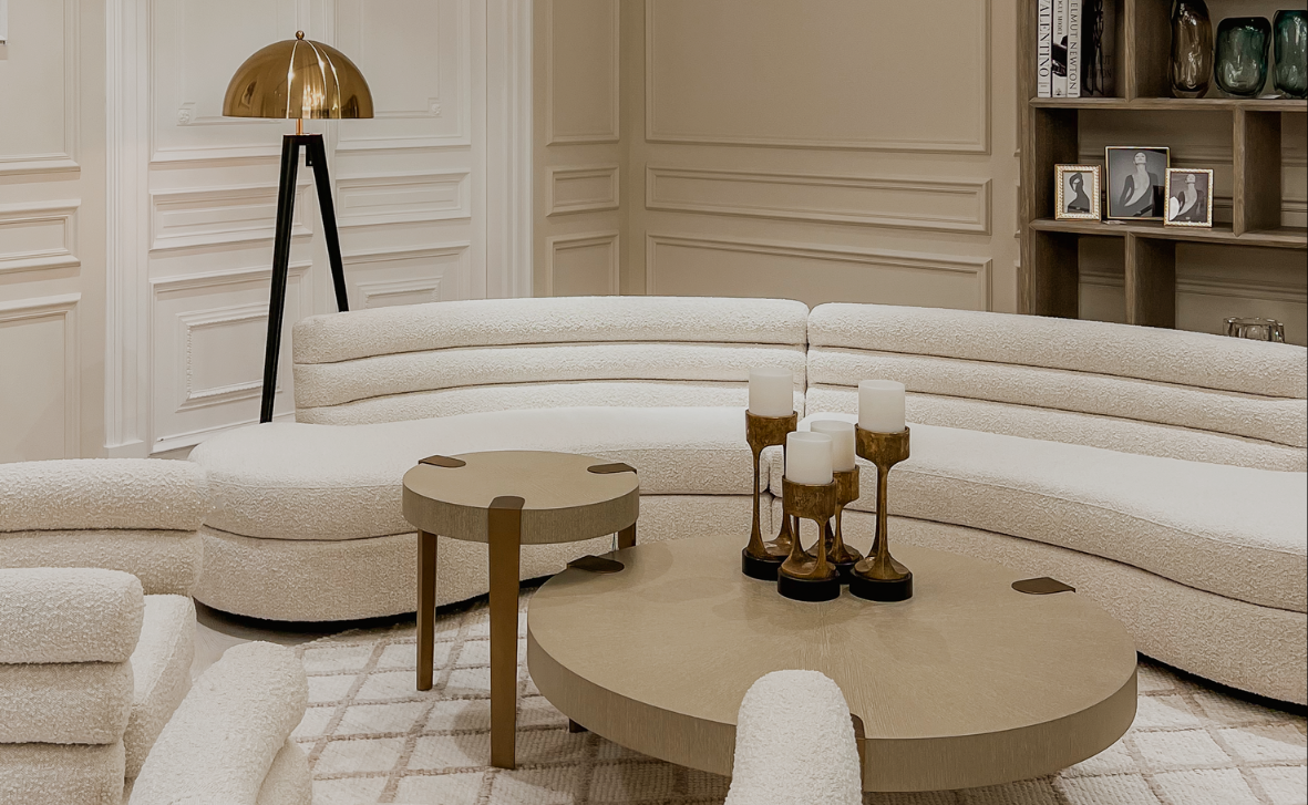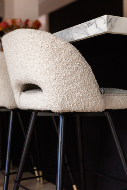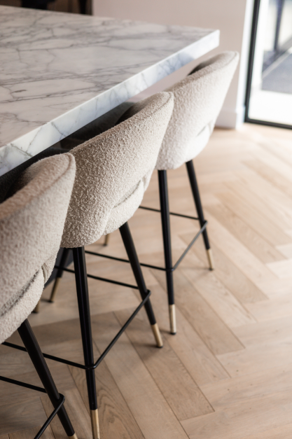 In het najaar van 2021 hebben we de bewoners meegenomen naar verschillende showrooms, waaronder Eichholtz in Noordwijkerhout. Het meubilair moet passen bij de lichte tinten, samen met de marmeren en houten elementen.