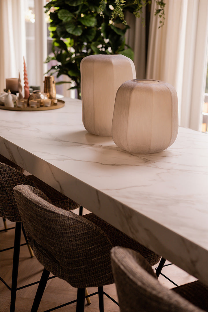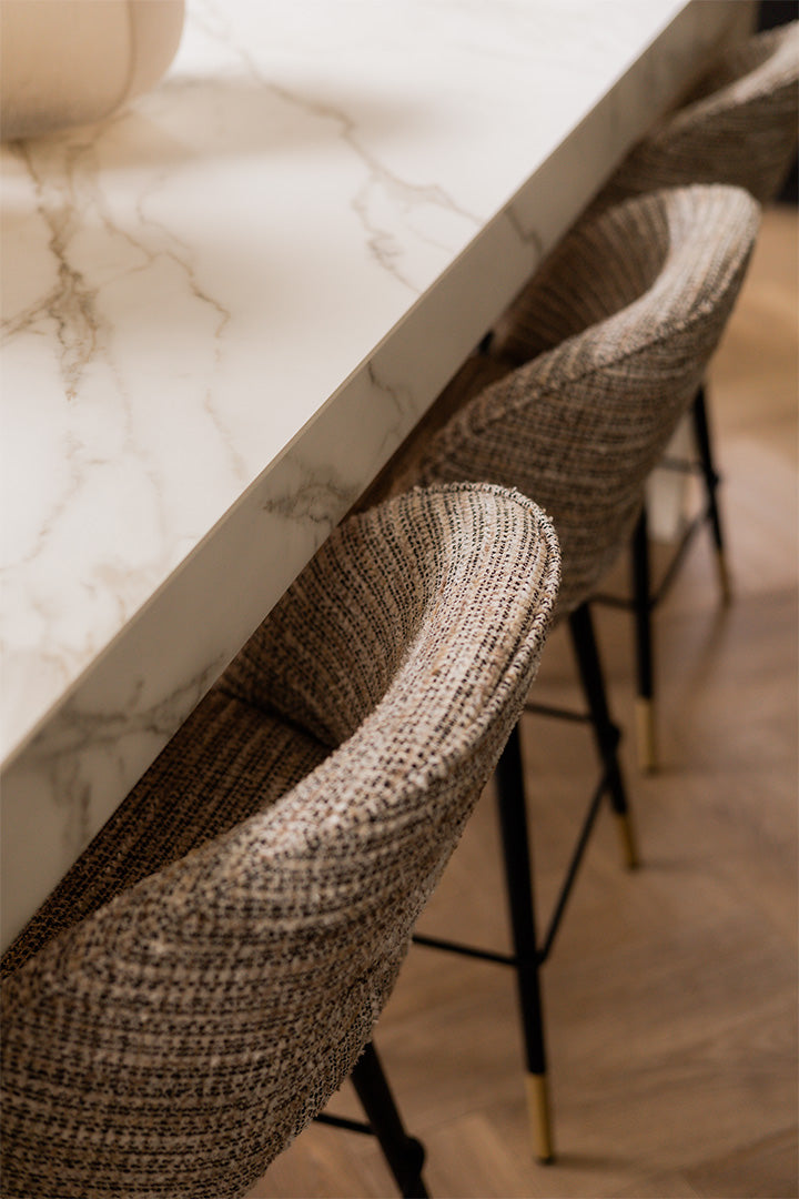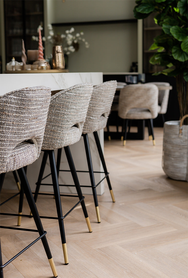 Het huis ziet er prachtig uit. De luxe barkrukken en eetkamerstoelen zijn van dezelfde stof, zodat het in de eetkamer één geheel is. In de zitkamer is gebruik gemaakt van teddy stof met warme tinten.
