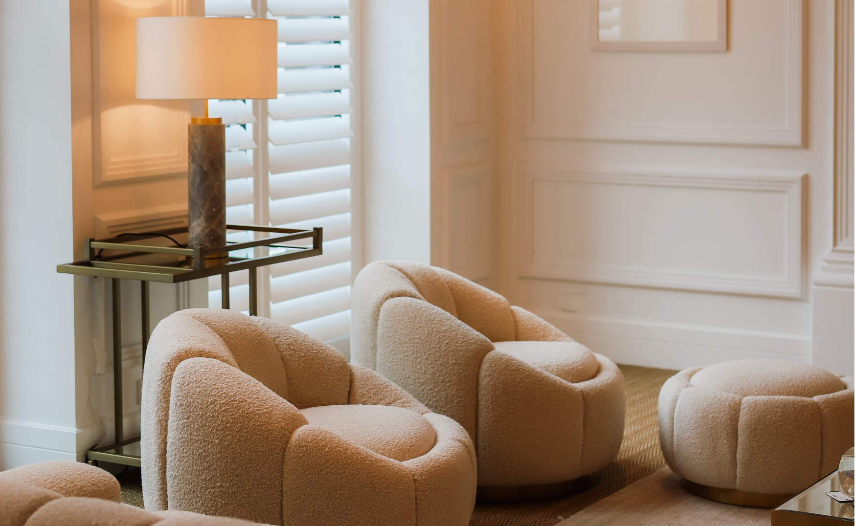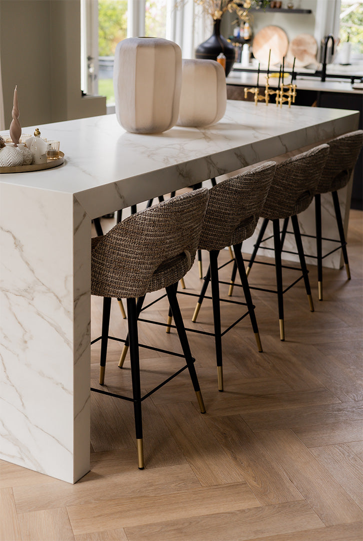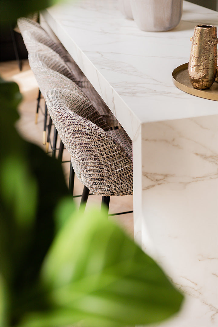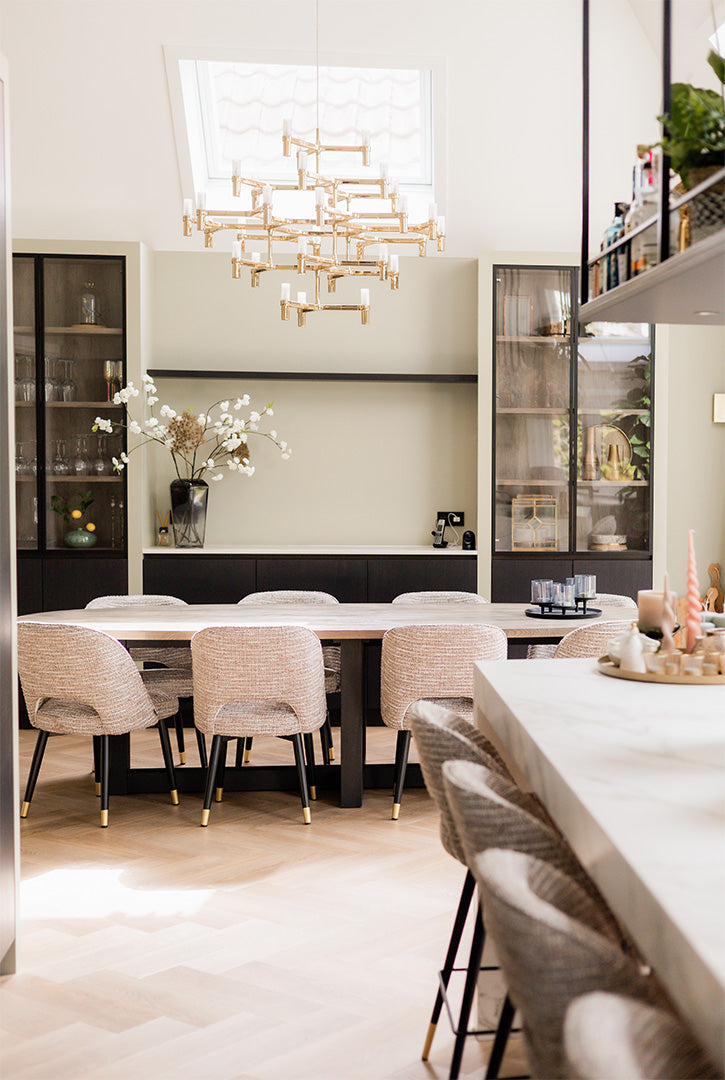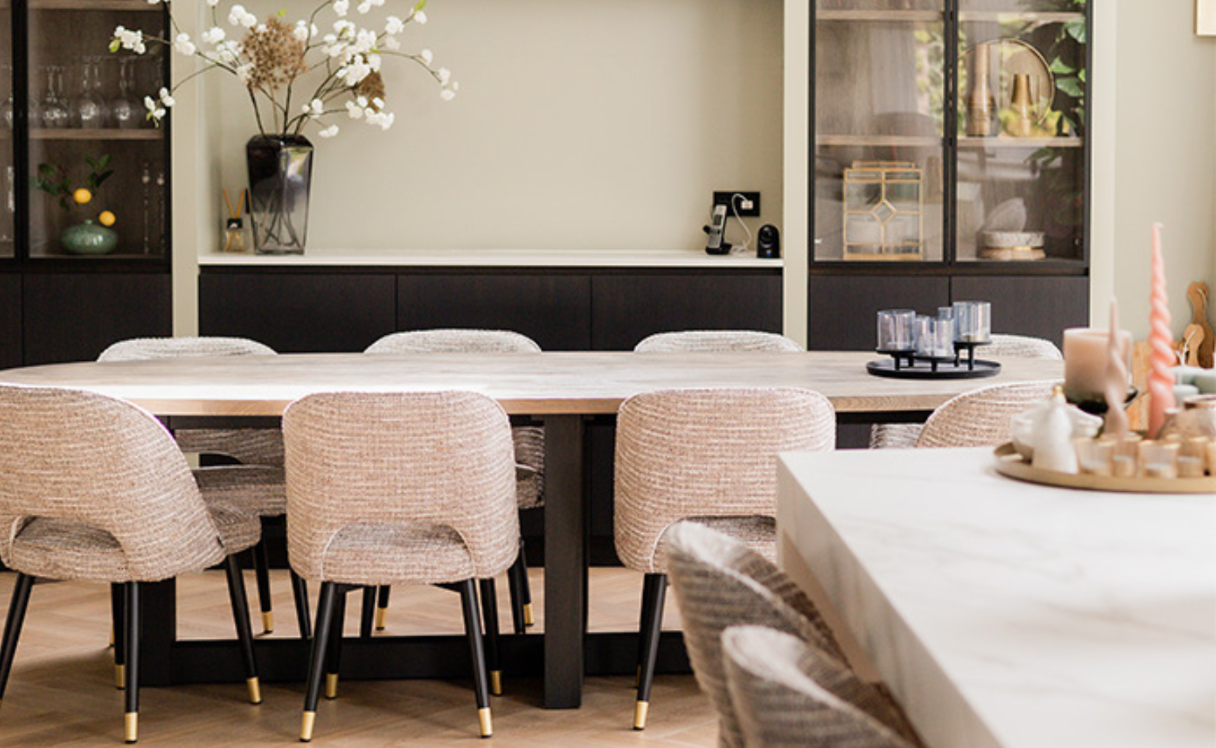 In het voorjaar van 2022 hebben we de bewoners meegenomen naar de showroom van Eichholtz in Noordwijkerhout. Het meubilair moet passen bij de lichtgroene hoofdkleur, samen met de marmeren en zwarte elementen.