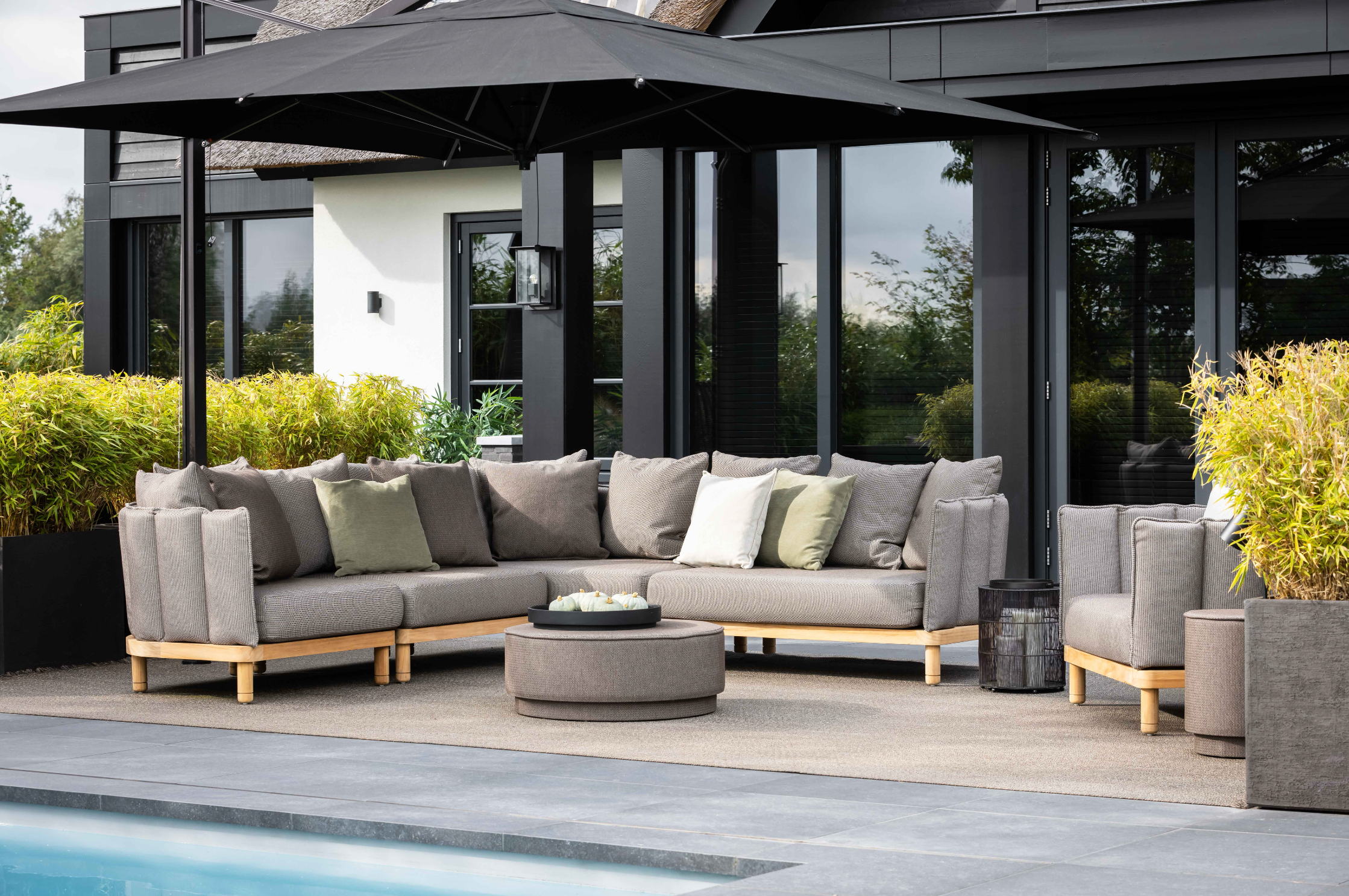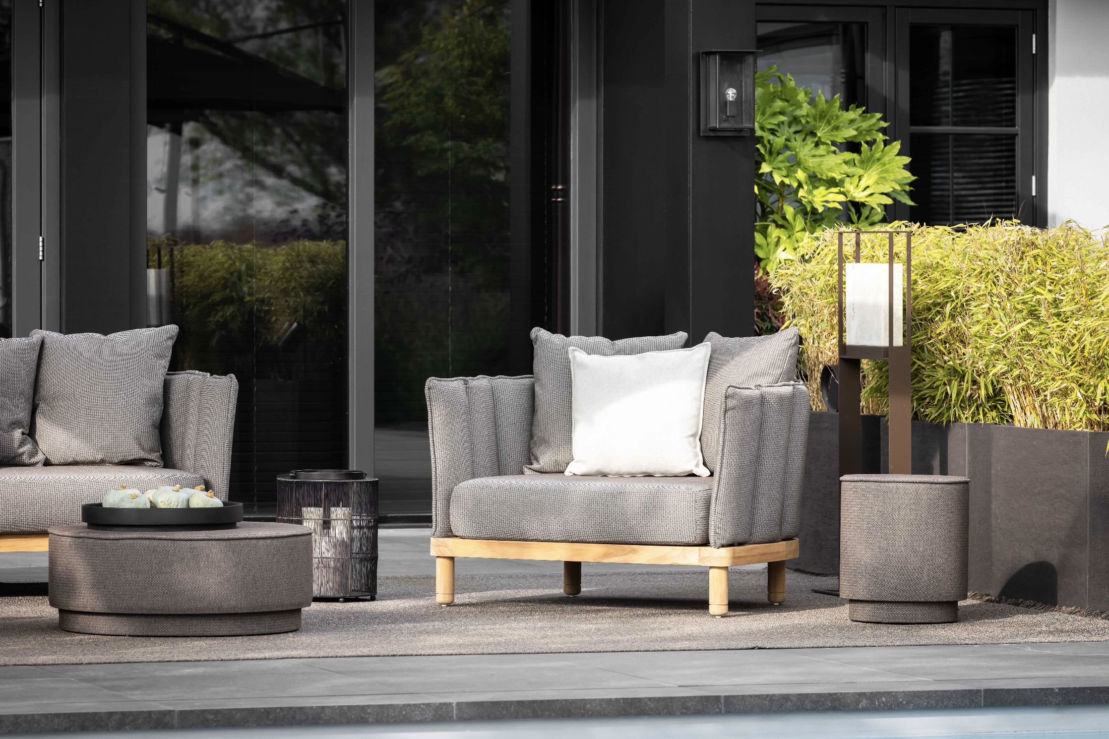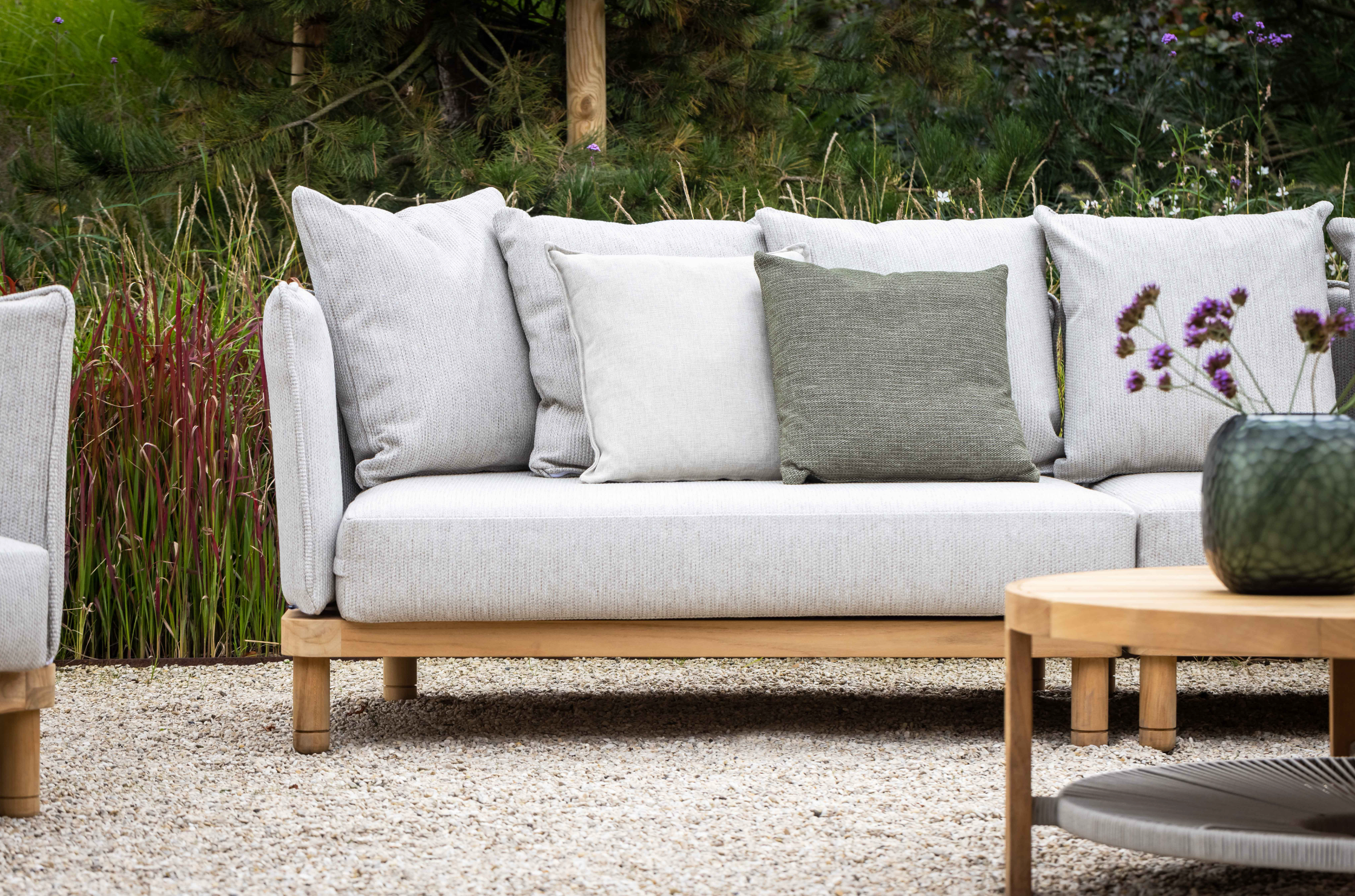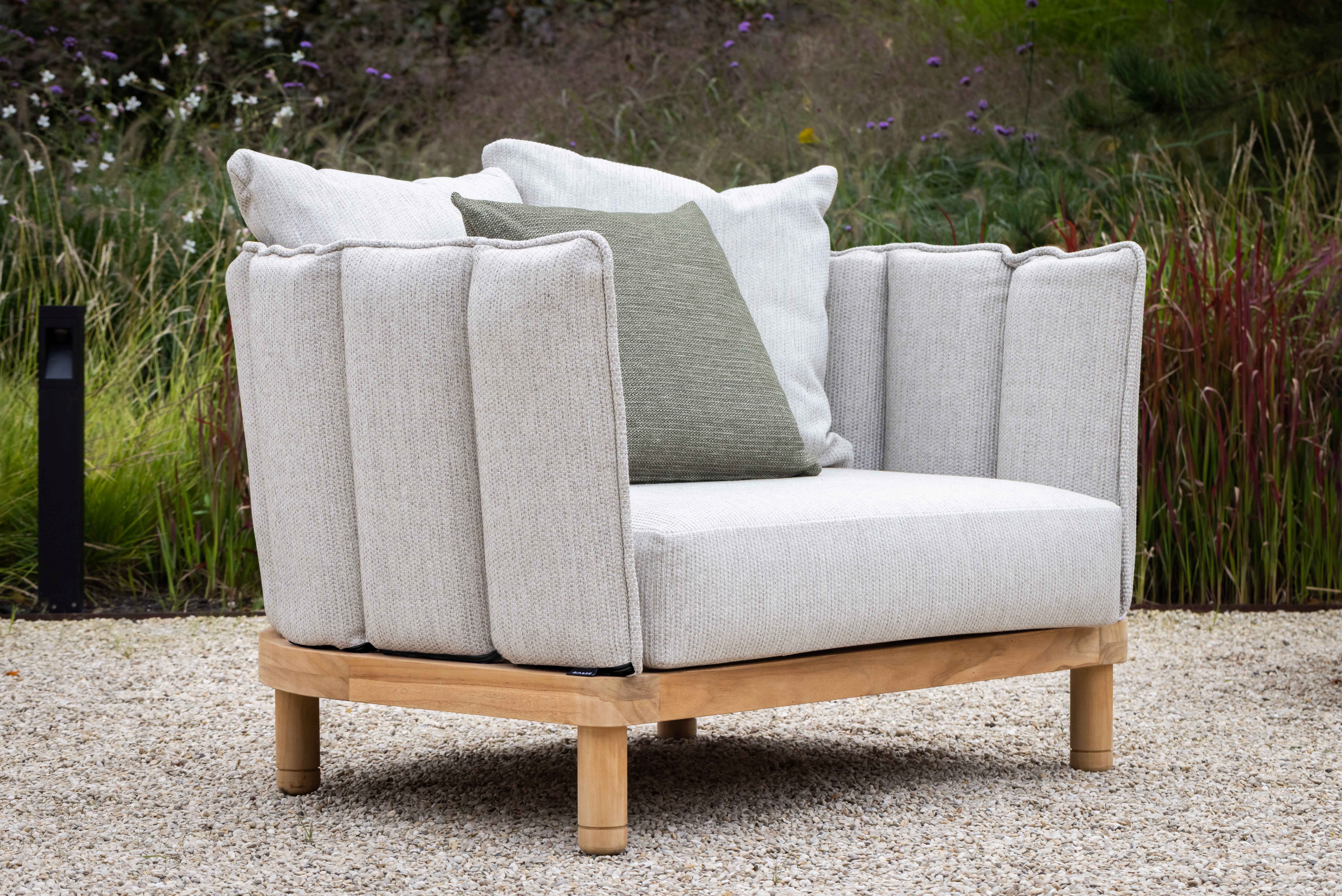 Het teakhouten onderstel van de robuuste Softline lounge seats oogt traditioneel. De grote verrassing schuilt in de afneembare stoffen opzet. Ambachtelijk aan elkaar bevestigde rugkussens, worden eenvoudig over aluminium staanders heen geschoven. Daarmee ontstaat een rond vloeiend en uiterst comfortabel lounge meubel. De decoratieve losse kussens in Shell stof Milky Brown, hebben een grofmazige structuur en zijn water- en vuilafstotend. De Softline collectie is volledig modulair, uitbreidbaar en zowel voor in- als outdoor geschikt.
