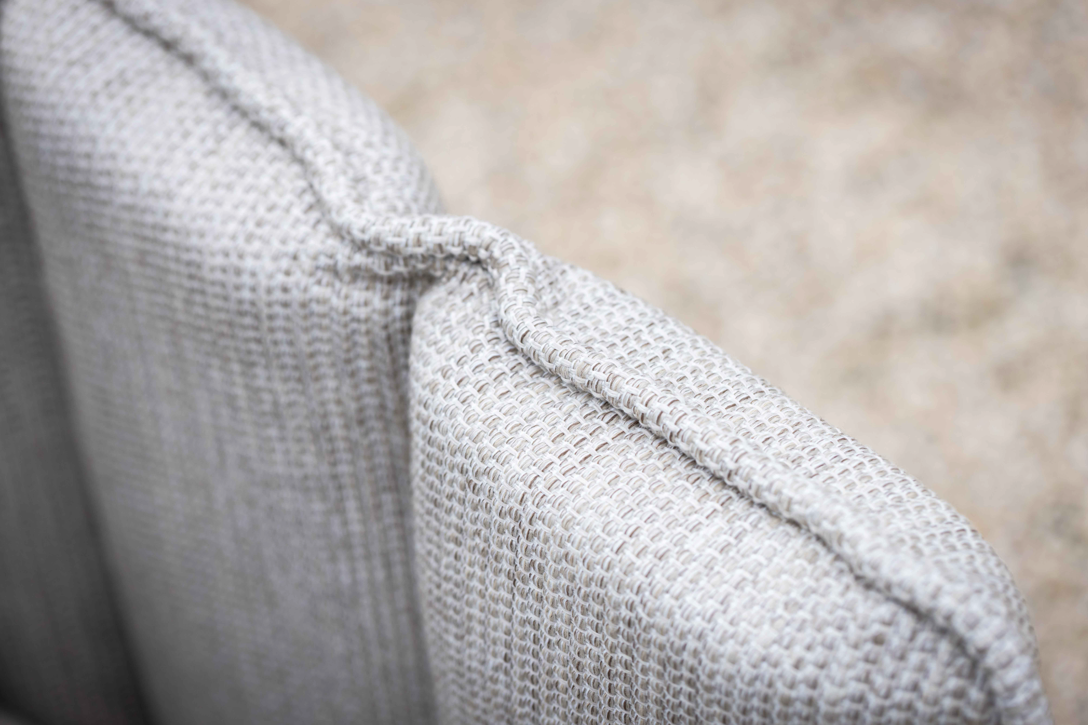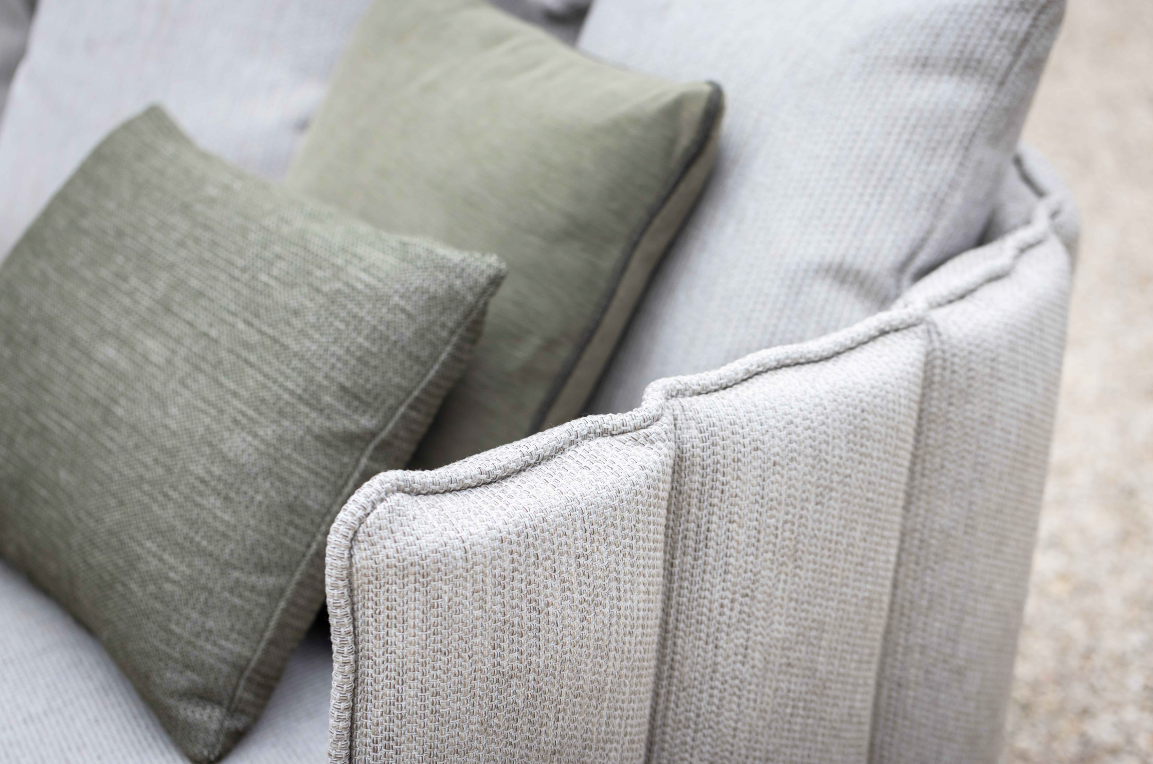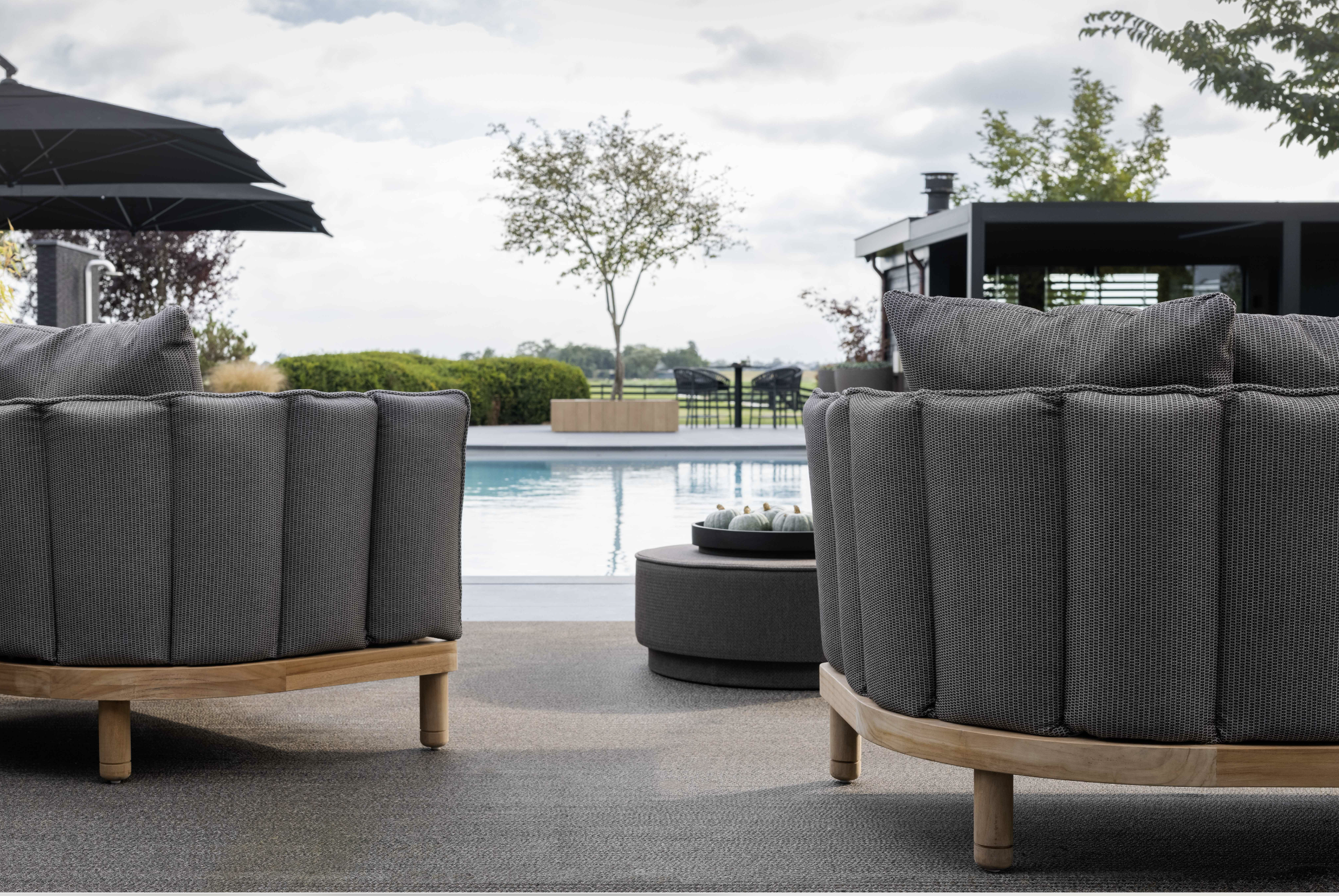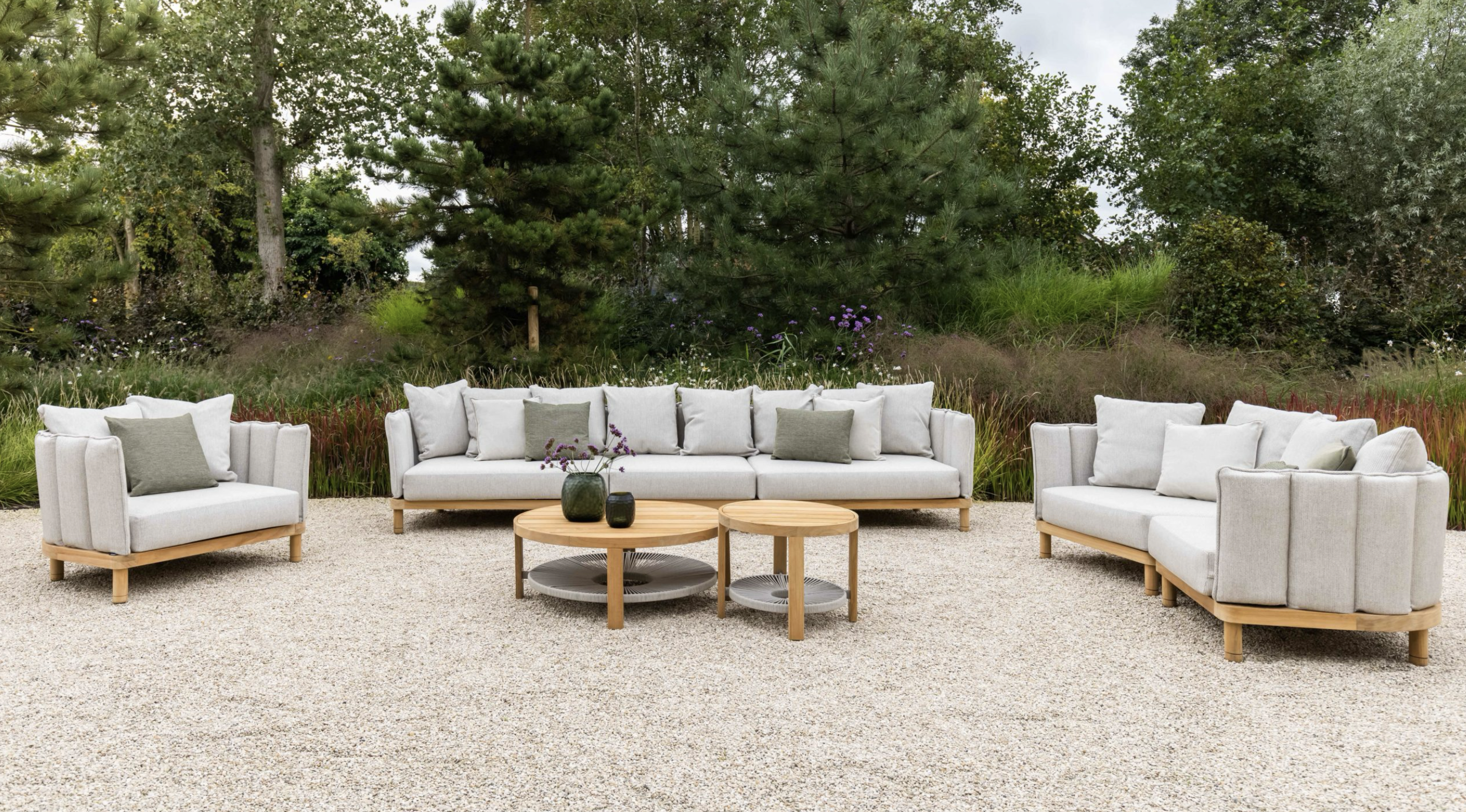 Het teakhouten onderstel van de robuuste Softline lounge seats oogt traditioneel. De grote verrassing schuilt in de afneembare stoffen opzet. Ambachtelijk aan elkaar bevestigde rugkussens, worden eenvoudig over aluminium staanders heen geschoven. Daarmee ontstaat een rond vloeiend en uiterst comfortabel lounge meubel. De decoratieve losse kussens in Shell stof Milky Brown, hebben een grofmazige structuur en zijn water- en vuilafstotend. De Softline collectie is volledig modulair, uitbreidbaar en zowel voor in- als outdoor geschikt.