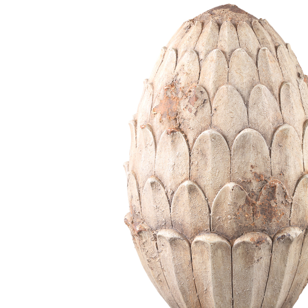 Geef uw interieur een vleugje natuurlijke charme met het Beeld Caibyn - A. Deze grijze, magnesia-dennenappelvormige sculptuur voegt een eigentijdse twist toe aan elke woonruimte.