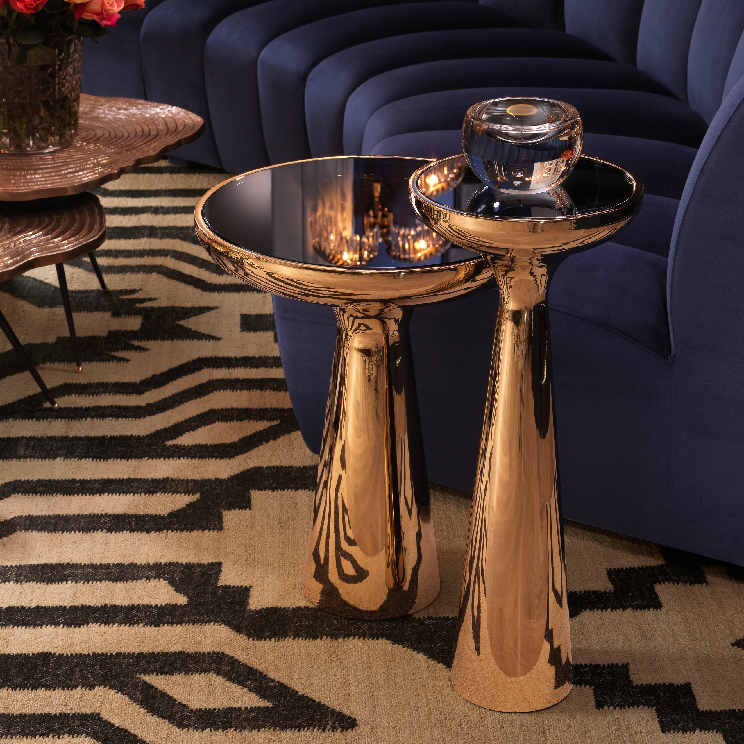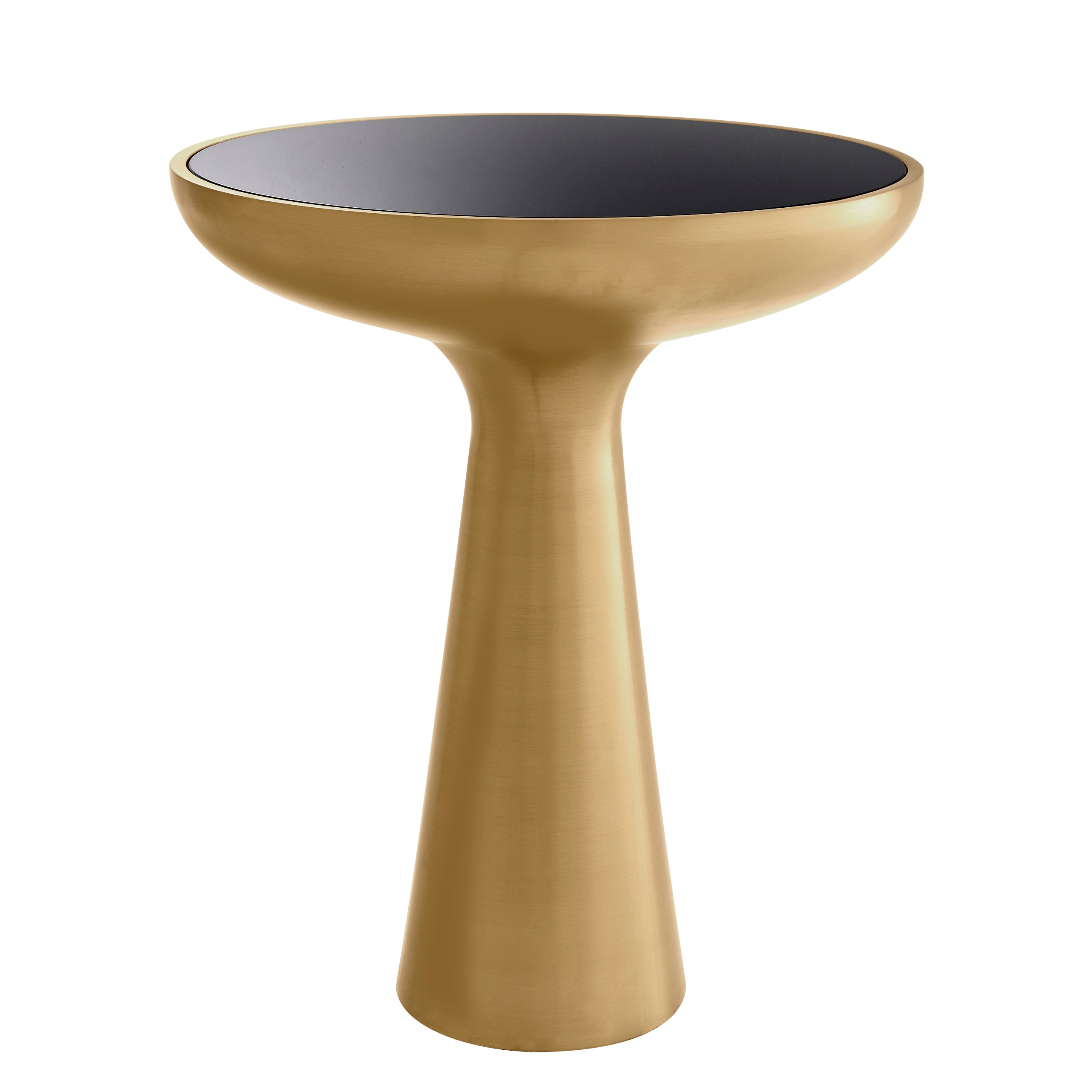 De organisch gevormde lage Lindos bijzettafel heeft stijlkenmerken van Scandinavische designmeubels uit het midden van de 20e eeuw. Deze prachtige ronde bijzettafel heeft een onderstel van geborsteld messing en een zwart glazen tafelblad.