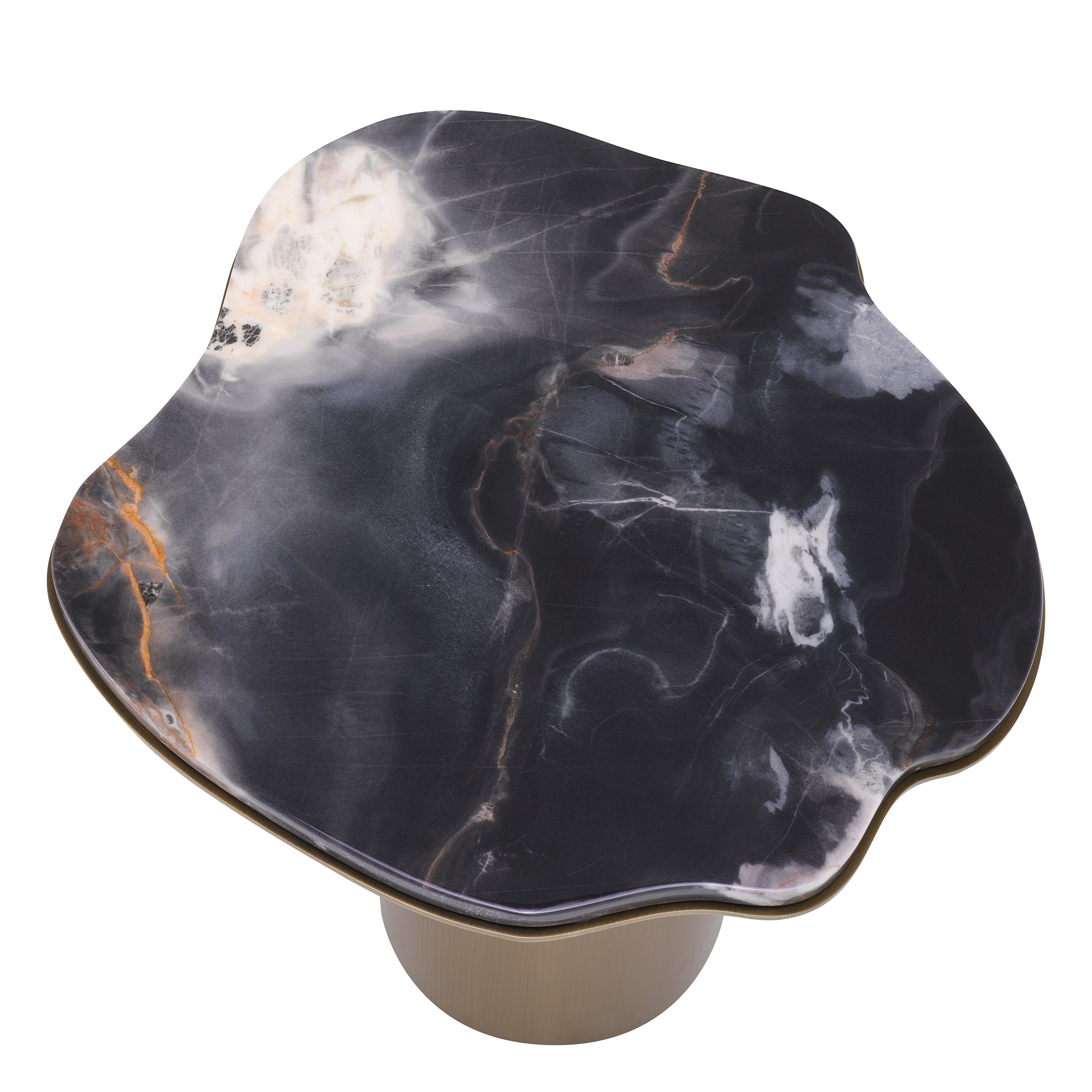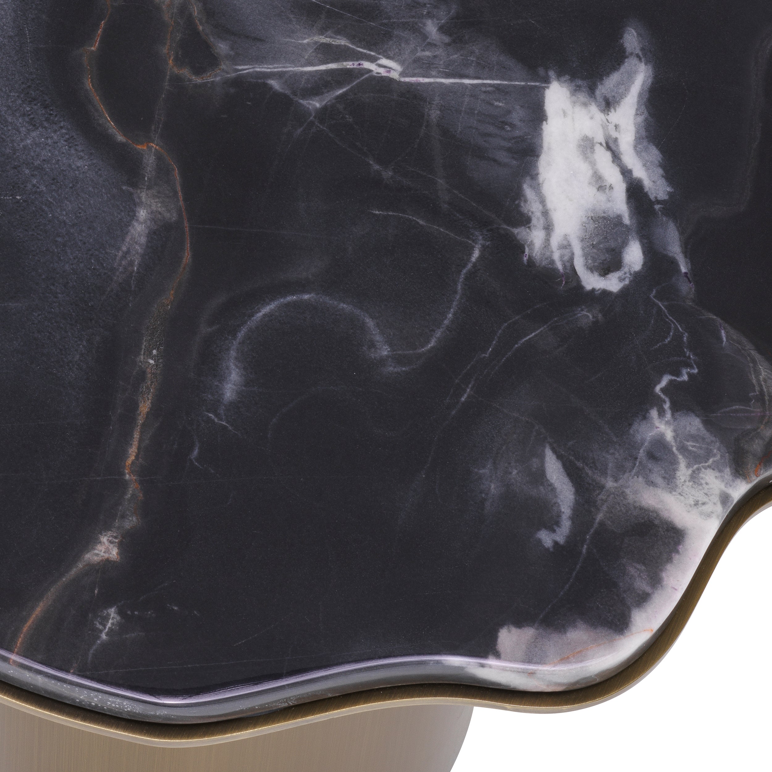 Dompel jezelf onder in de weelderige sfeer die de Shapiro Bijzettafel in je woonruimte brengt. De boeiende aanwezigheid straalt luxe en verfijning uit, met een opmerkelijk marmeren blad dat sierlijk danst met zijn unieke patronen en nerven. De vrije vorm voegt een element van artistieke expressie toe en verheft het tot een buitengewoon stukje functionele kunst. De geborstelde koperen afwerking van de basis straalt weelde uit en vormt een perfecte aanvulling op de allure van het marmer.