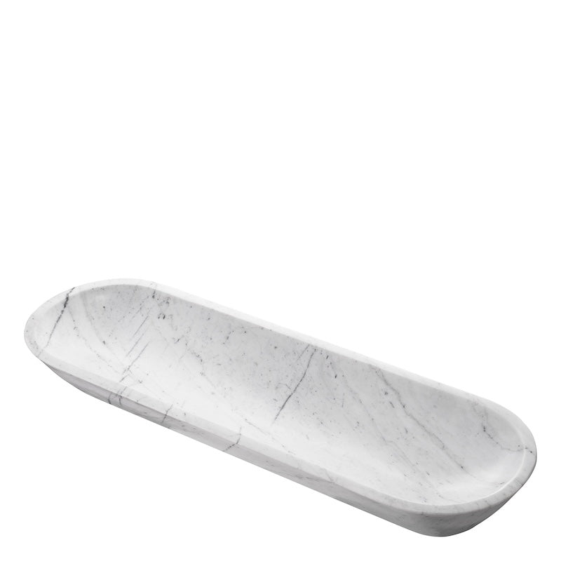 De Hulton schaal van Eichholtz is een toonbeeld van ingetogen luxe. Gemaakt van massief wit marmer met natuurlijke grijze aders, straalt deze langwerpige schaal pure elegantie uit. Het minimalistische design en de verfijnde afwerking maken dit object tot een tijdloze toevoeging aan elk interieur.