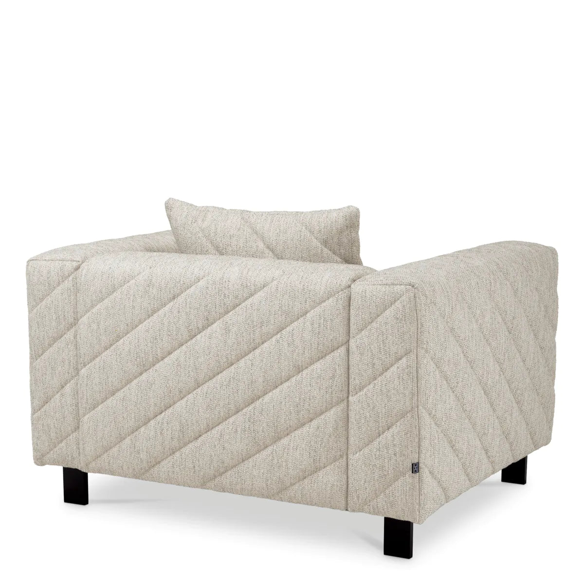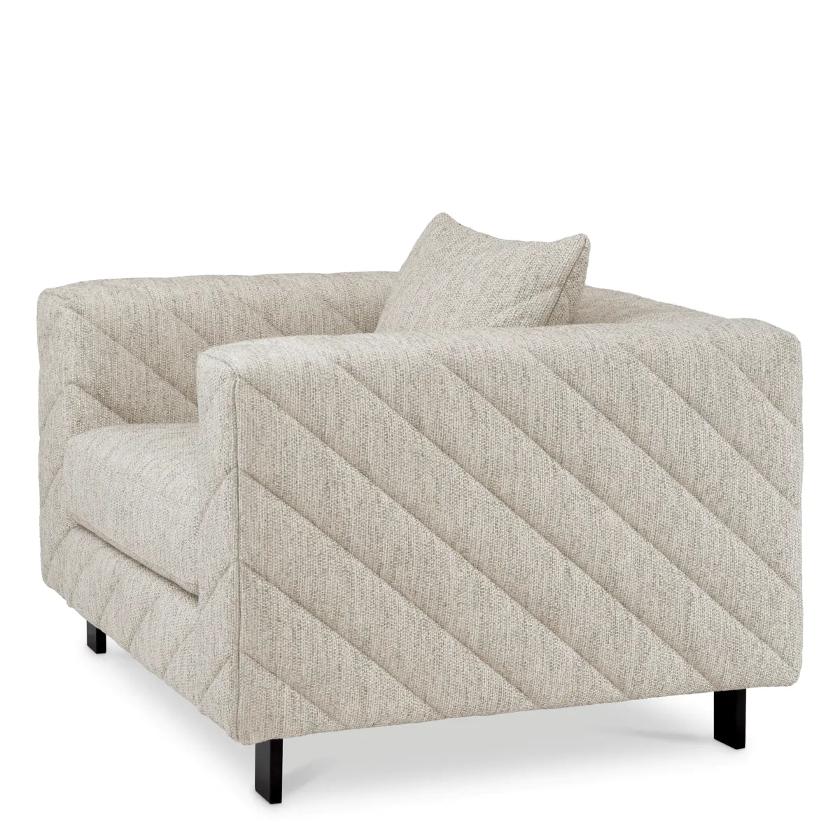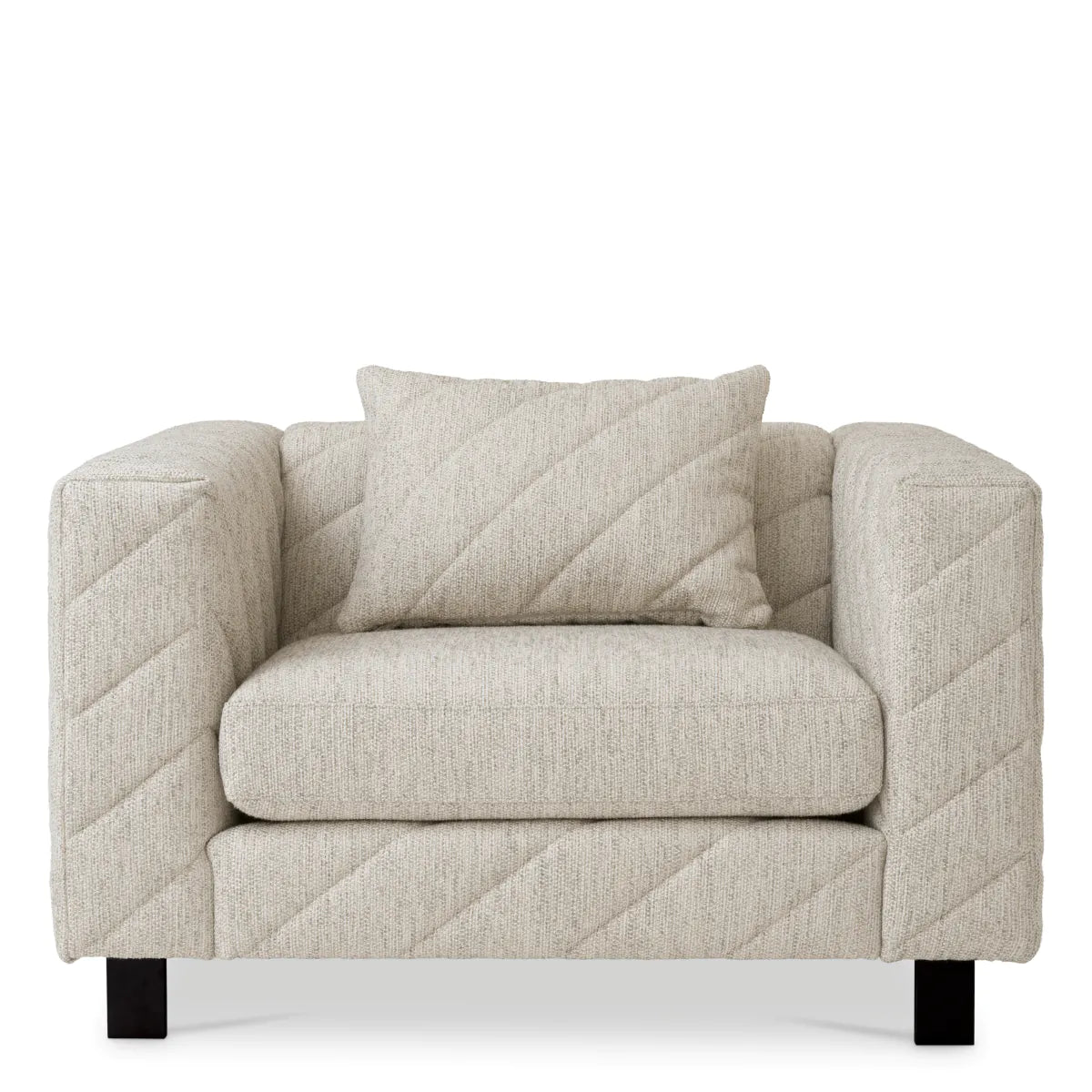 Een stijlvolle fauteuil met uniek patroon en zachte kussens, bekleed in lichtgrijze Splendor stof, ideaal voor een verfijnd interieur. Meer informatie
