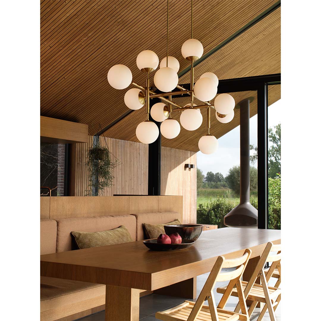 Een speels patroon van georganiseerde segmenten vertelt een verhaal van verfijnde bollen verlevendigd met koperen lijnen. De betoverende structuur van mondgeblazen lichtbollen creëert een vormveranderende vorm die bij elke weergave verandert.
