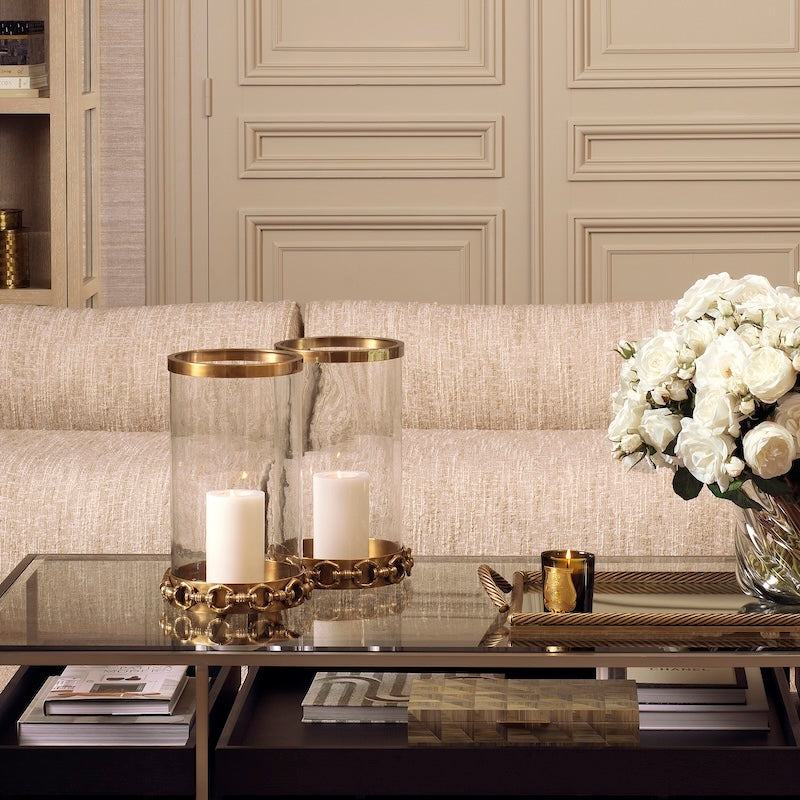 De Hurricane Clementine L van Eichholtz is een statement piece dat vakmanschap en elegantie samenbrengt. De cilindervorm in helder glas wordt omlijst door een vintage brass frame en gedecoreerd met een karakteristieke ketting, wat zorgt voor een luxueuze en onderscheidende uitstraling.