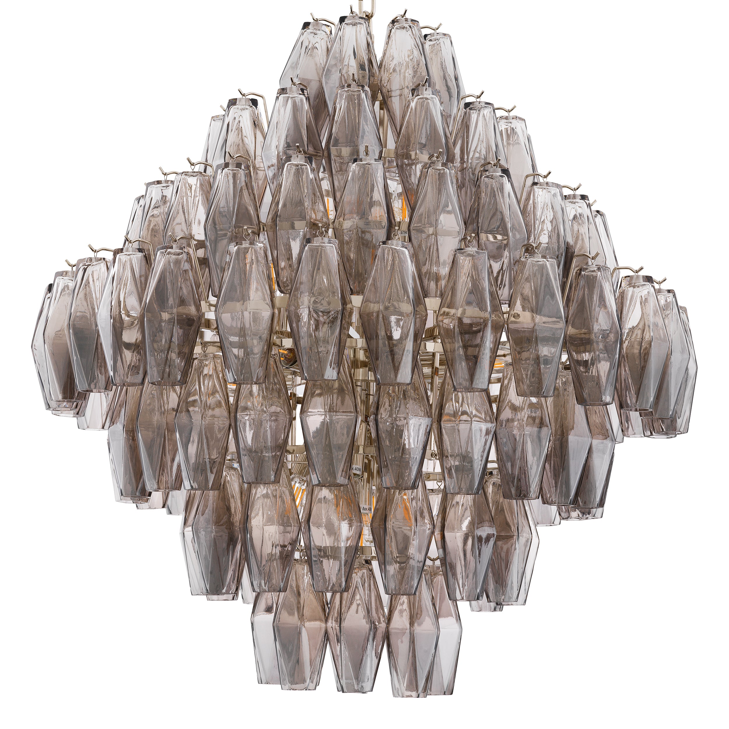 De Benini-kroonluchter verpakt betoverende charme en schoonheid in een briljant ontwerp. Deze prachtige taps toelopende kroonluchter met nikkelafwerking is voorzien van ruitvormige buizen van gerookt glas die het licht doorlaten en een fascinerende lichtweergave creëren. Ook verkrijgbaar in een grote versie. Groepeer samen voor een boeiende sfeer.