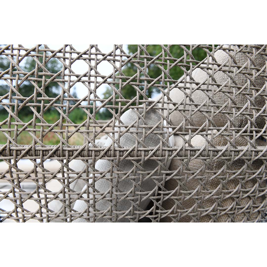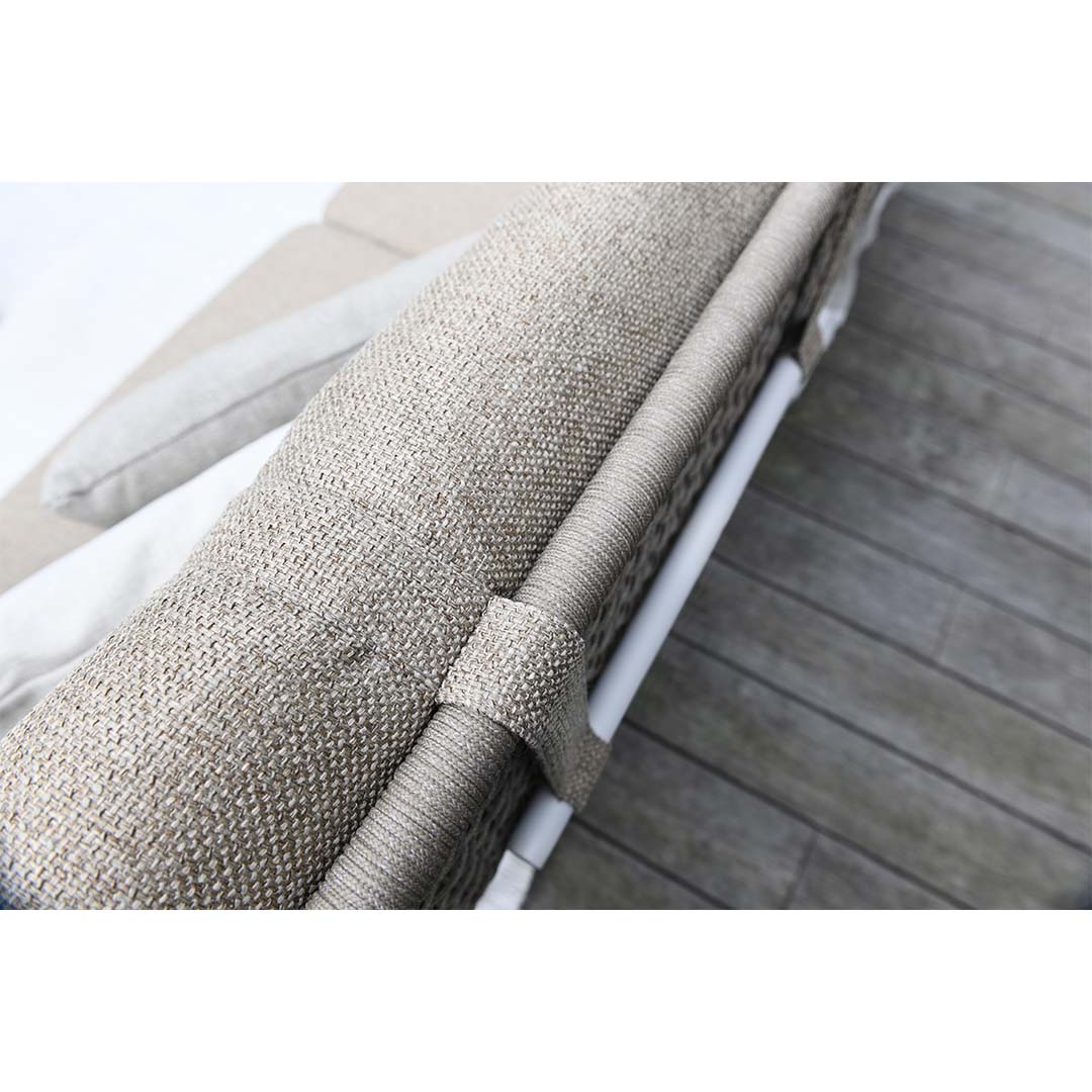 De Modulaire bank Jane Right is uit de Collectie Jane. De collectie omvat een zevental modulaire lounge items die zich prachtig laten combineren. Wat direct opvalt is de hoge rugpositie met ergonomisch gevormde luxe kussens. In combinatie met transparant gevlochten en camel kleurig rope, nodigt Jane uit voor ultiem relaxmoment. Technisch vernuft zit verstopt in de hoofdsteun met verzwaard contragewicht. Daarmee biedt Jane een uiterst prettige en stabiele hoofdondersteuning. Alle Jane items zijn van buisvormig aluminium en de safari-kleurige kussens laten een aantrekkelijke textuur zien die prettig aanvoelt.