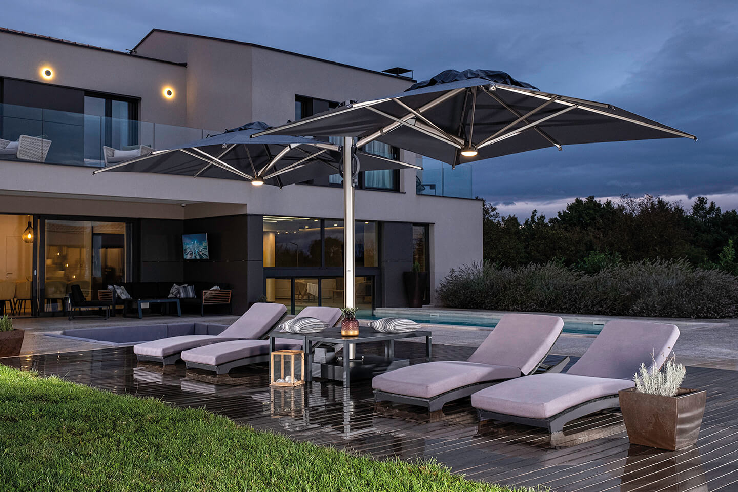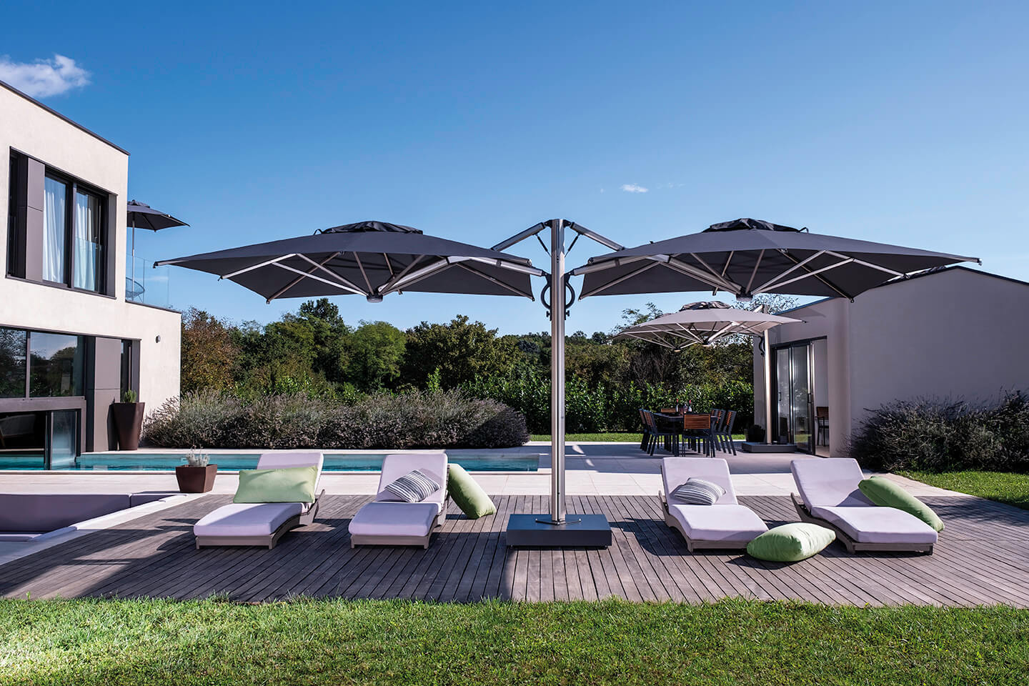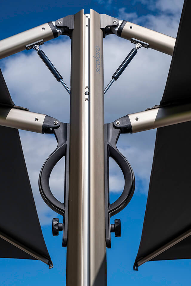 Deze parasol beschikt over een intrekbare structuur die het mogelijk maakt om de parasol boven tafels en stoelen te openen en te sluiten zonder het meubilair te verplaatsen, wat uitzonderlijk handig is in drukke commerciële omgevingen zoals bars, restaurants en hotels. Het aluminium frame heeft een stijlvolle antraciet metallic afwerking die zowel duurzaamheid als een moderne uitstraling biedt. Deze robuuste constructie bestaat uit twee parasols die naast elkaar zijn geplaatst en verankerd aan een enkele steunmast, wat zorgt voor een sterke en stabiele opstelling. Dit ontwerp maakt de parasol geschikt voor alle locaties en toepassingen, waarbij functionaliteit en esthetiek perfect worden gecombineerd om een superieure schaduwoplossing te bieden. Specifiek ontworpen om in een T-vorm te staan, wat zorgt voor een brede dekking en symmetrische schaduwverdeling, ideaal voor situaties waarin een centrale schaduwplek nodig is.