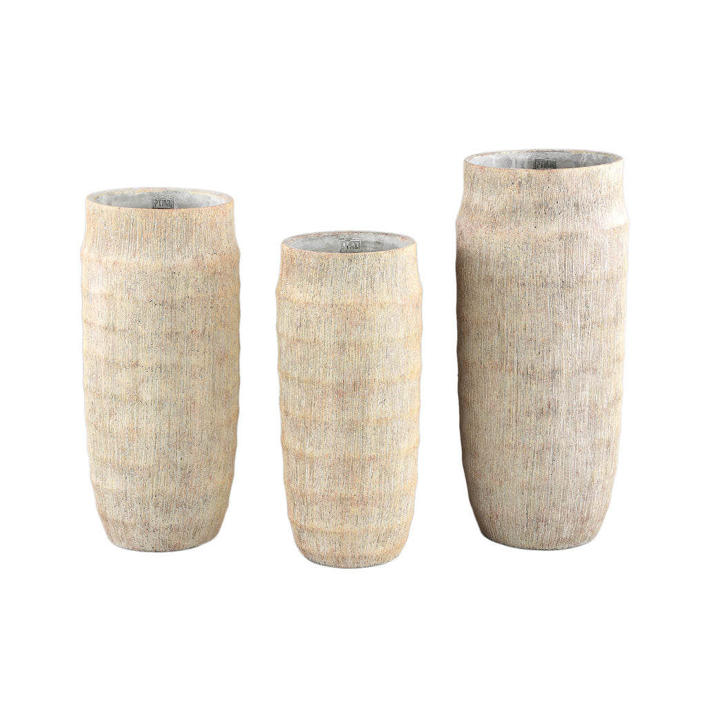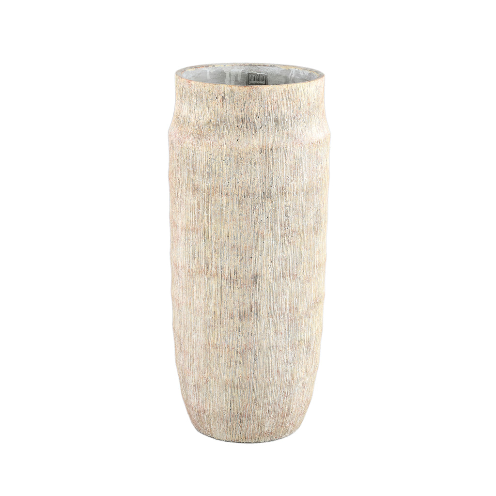 De Pot Sary - Crème - L is een hoge cementpot met een minimalistisch streepjespatroon, ideaal voor een moderne uitstraling.