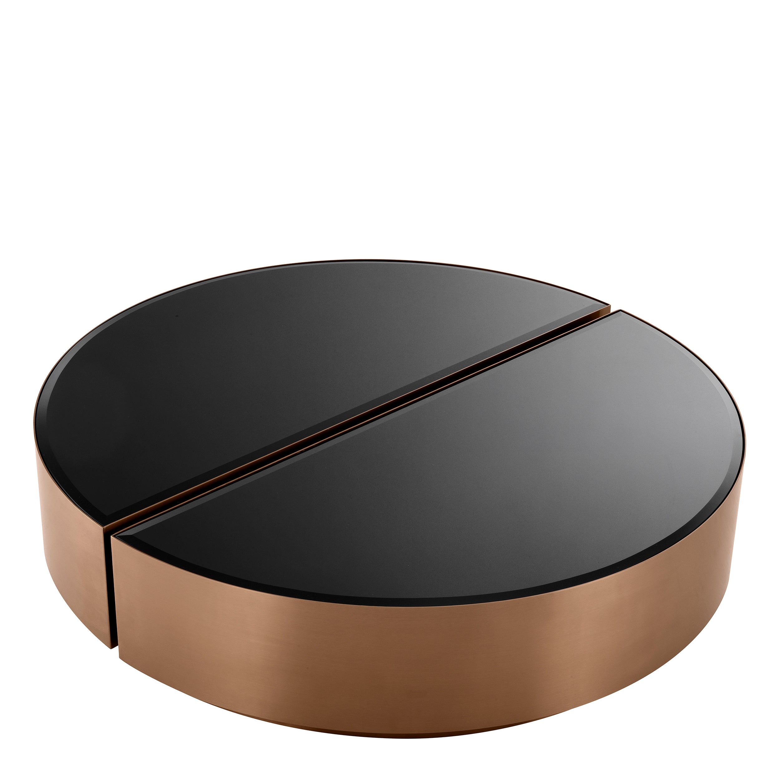 Deze prachtige set van 2 halfronde Astra Coffee Tables geeft je veel indelingsmogelijkheden. Elke tafel heeft een geborsteld koperen onderstel en een halfrond tafelblad van afgeschuind zwart glas. Personaliseer naar wens: gebruik elke tafel als een enkel stuk, vlakbij de armleuning van je bank, transformeer hem in een nachtkastje, plaats hem tegen een muur als lage console of combineer hem als een eiland in het midden van je zitgroep.
