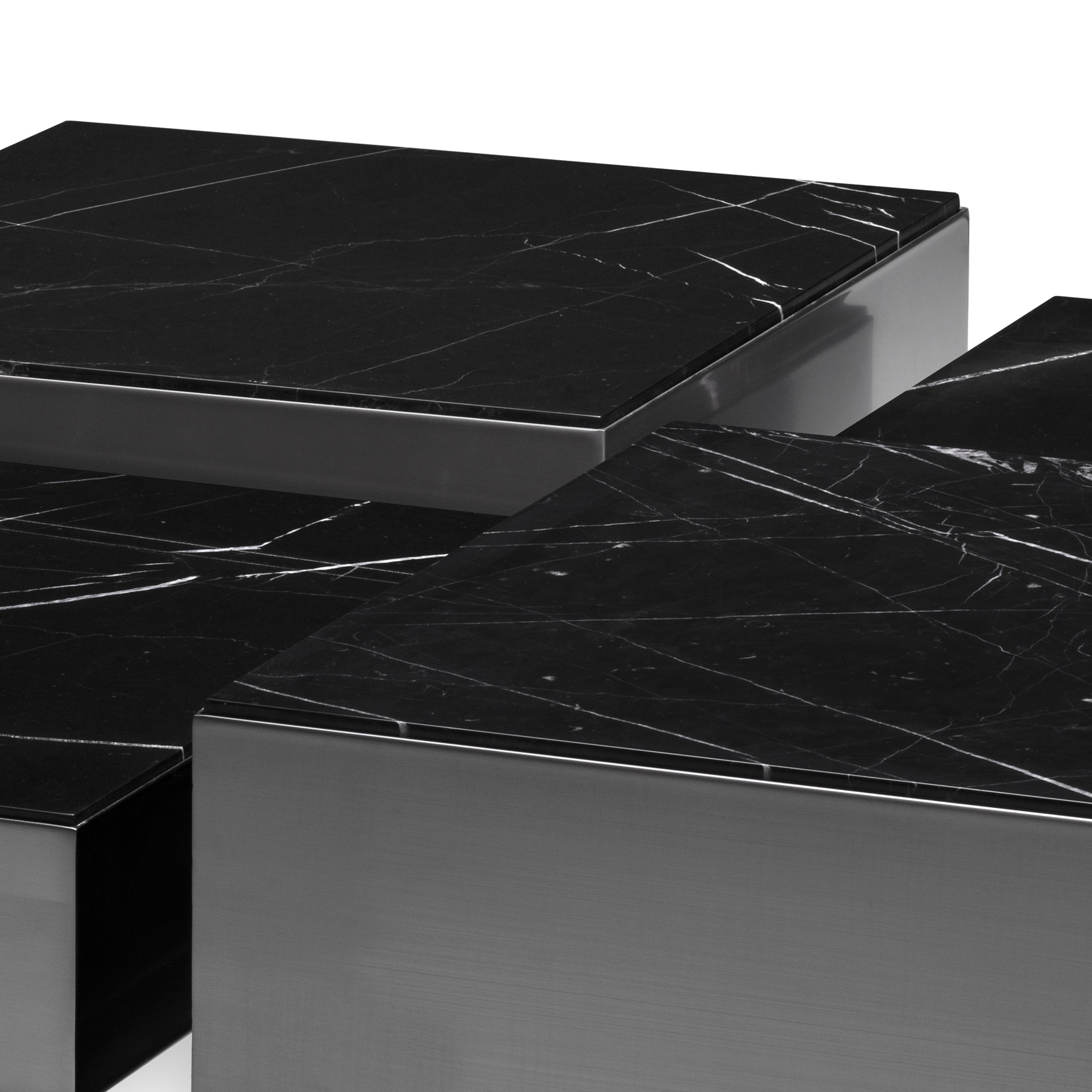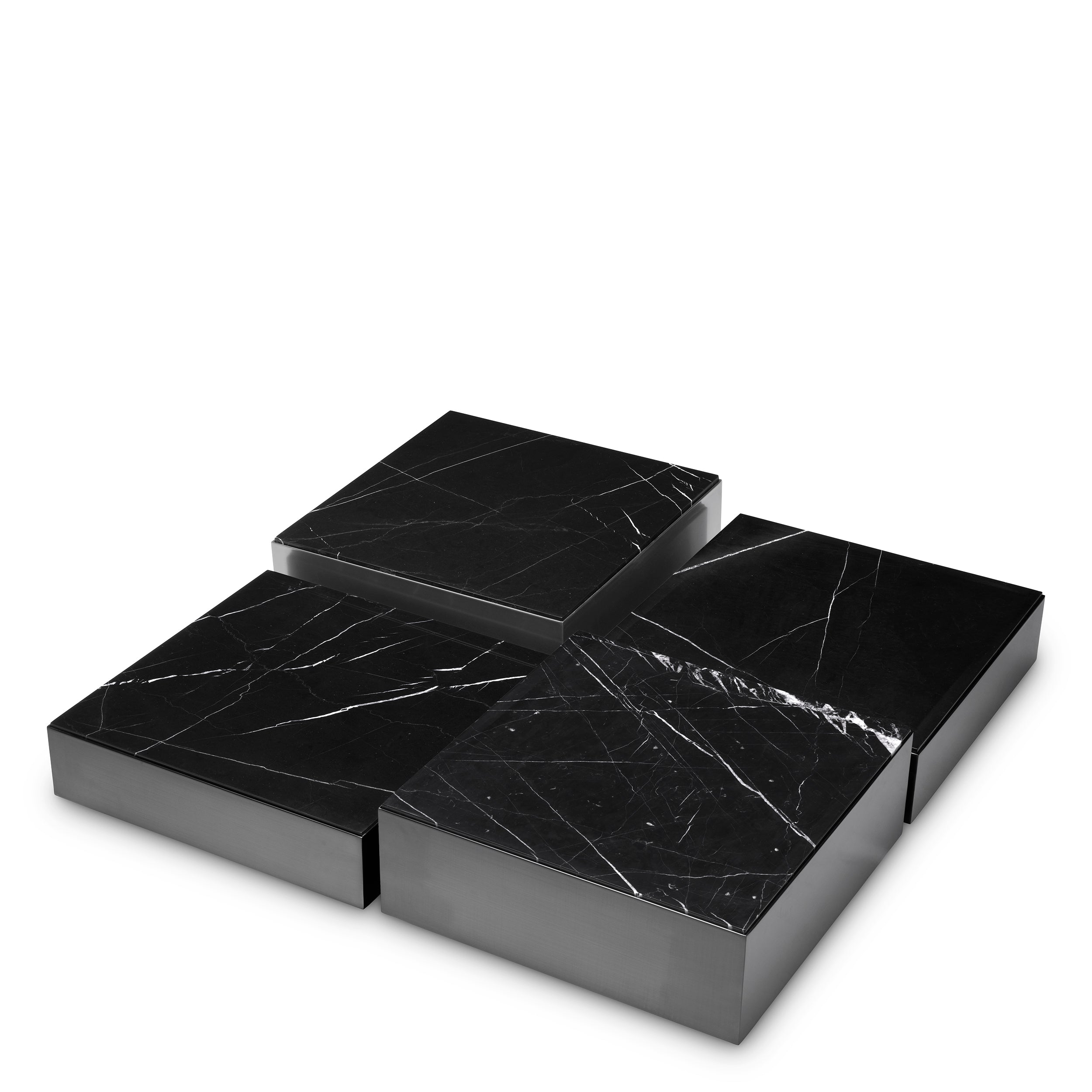 Salontafel Esposito geeft elke woonruimte een modieuze uitstraling dankzij het moderne design. Verschillende niveaus maken deze 4-delige configuratie verrassend veelzijdig. De 2 lage en 2 hoge elementen kunnen worden gegroepeerd om een grote salontafel te vormen of als individuele accenttafels worden gebruikt. Gemonteerd op een stevige zwarte basis. heeft elk stuk bronzen afgewerkte zijkanten en een blad van zwart marmer.