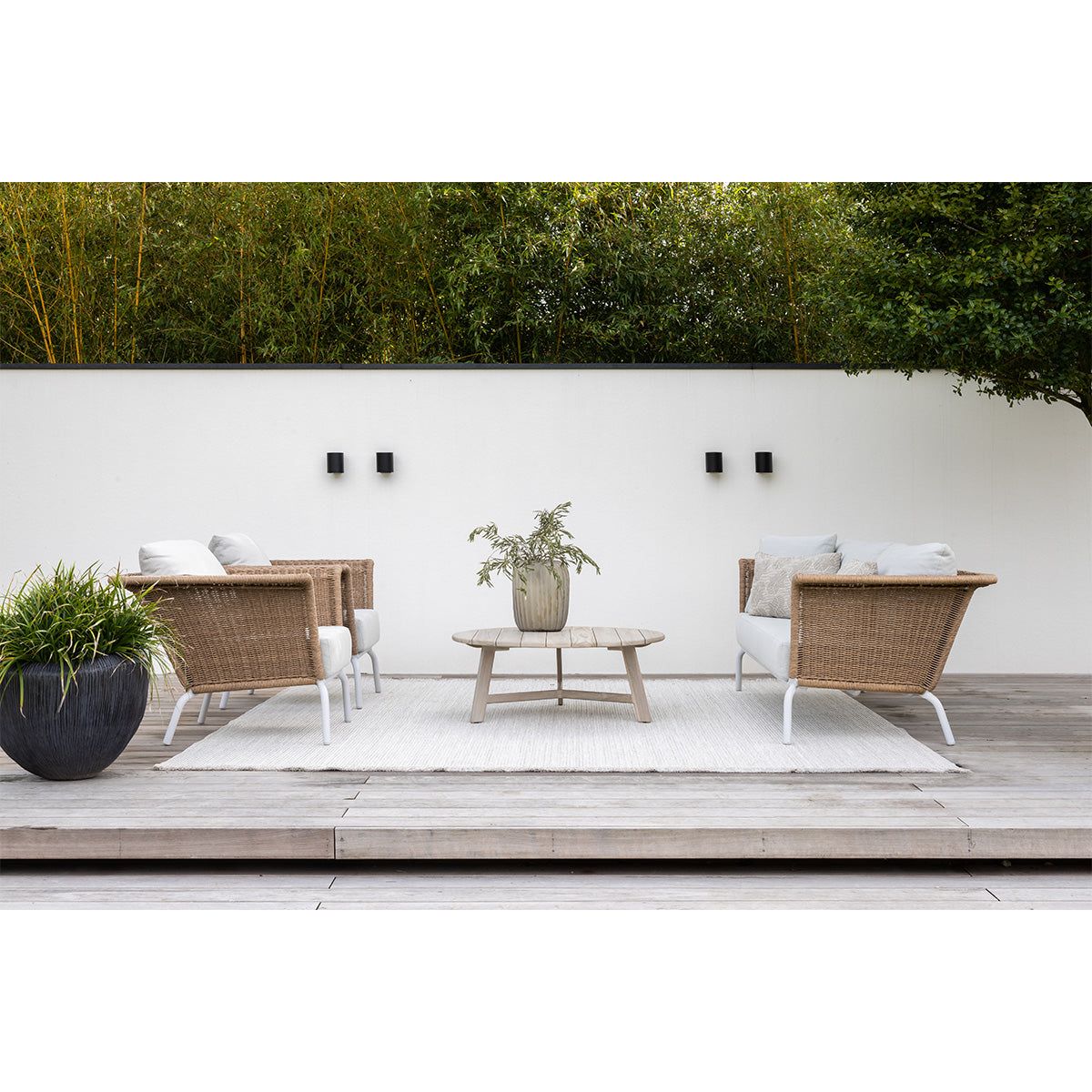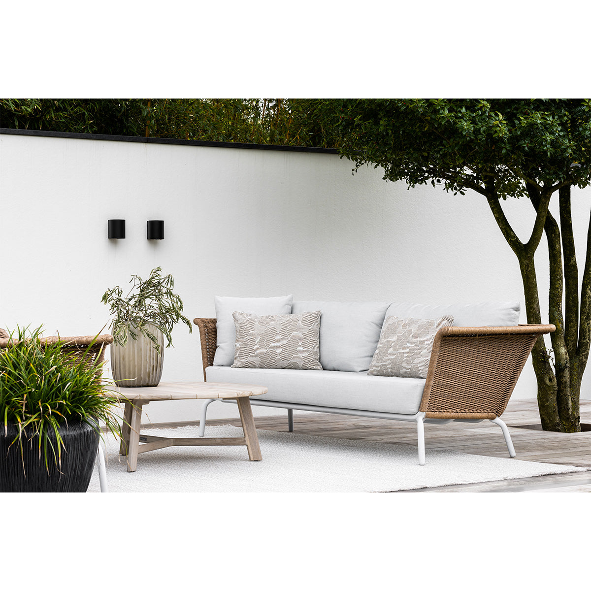 De prachtige Stanley staat wat hoger op zijn poten dan de gemiddelde loungeset en oogt daardoor ook vrij luchtig. Net als de bijpassende Aria-stoel is het fiber gedraaid waardoor de uitstraling extra ambachtelijk is. De Stanley is uitgevoerd in zachte, aardse tinten: warm bruin ‘safari ‘ voor het fiber, ‘stone’ voor het aluminium frame en lichtgrijs voor de kussens. De rugleuning loopt in één lijn door naar de armleuningen. De aluminium pootjes zijn licht gebogen, passend bij de ronding van de leuning, die een frivole uitstraling aan de sofa geeft. Dat geldt ook voor de Stanley lounge chair, waarbij de prachtige leuning optisch nog meer in het oog springt.
