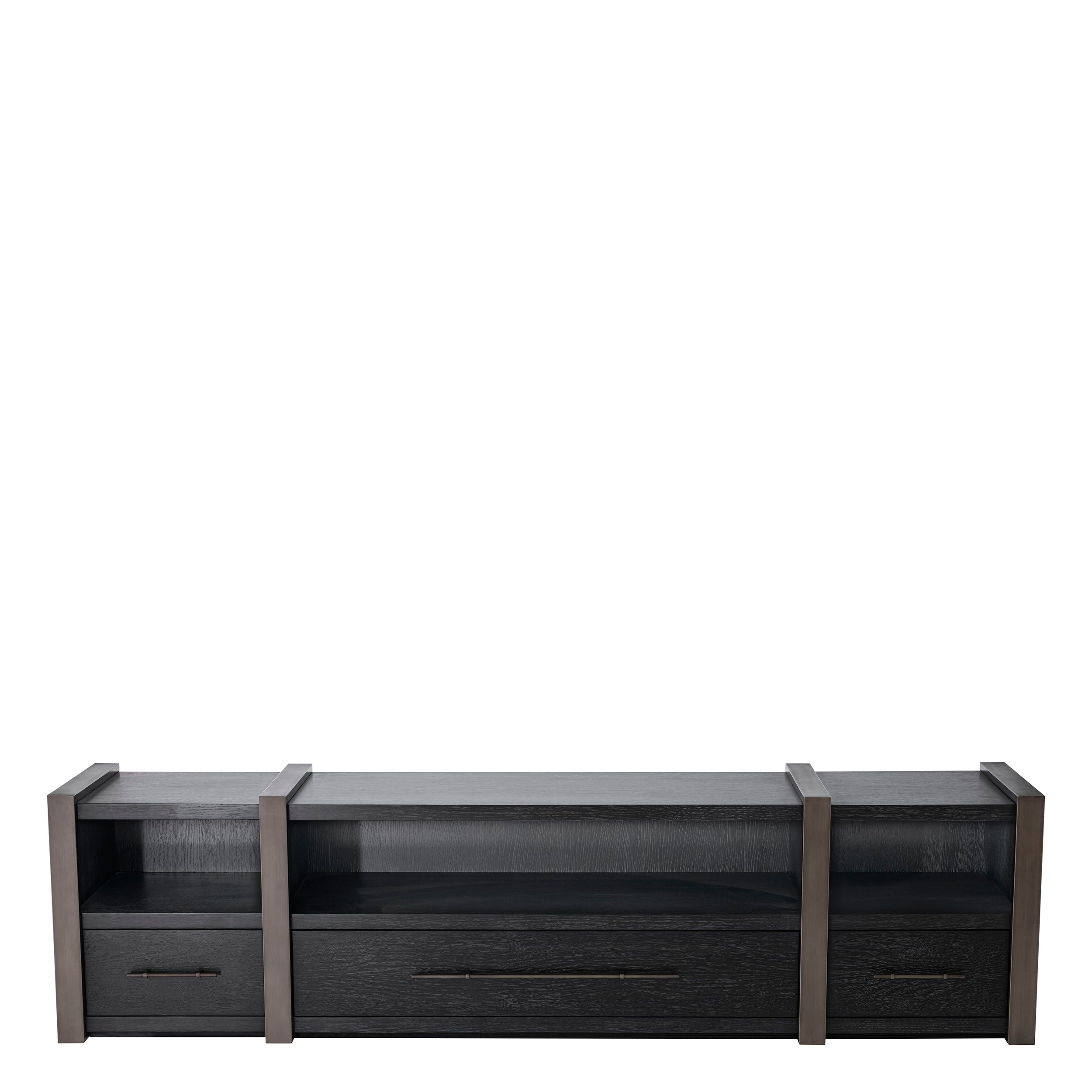Praktisch en stijlvol. het eigentijdse Canova tv-meubel biedt veel opbergruimte met een open gedeelte voor het uitstallen van items. een grote lade in het midden en 2 kleinere lades aan weerszijden. Het antracietgrijze eikenfineer van de kast past goed bij de medium bronzen afwerking van het frame en de handgrepen.