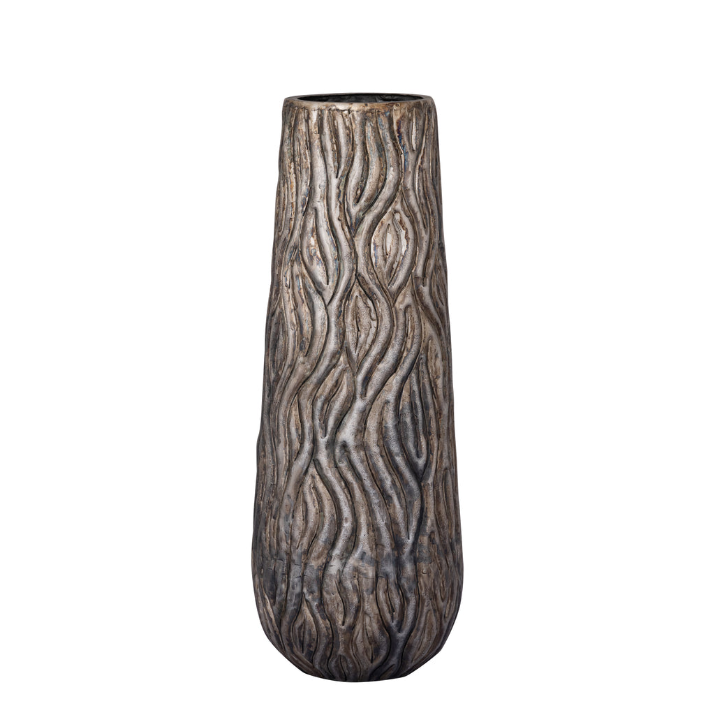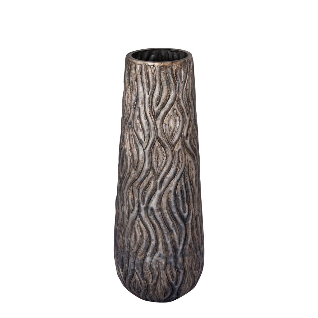 De Vaas Deandra - Hoog - L is een prachtige vaas van zilverkleurig aluminium met een golfpatroon, perfect voor een moderne uitstraling.