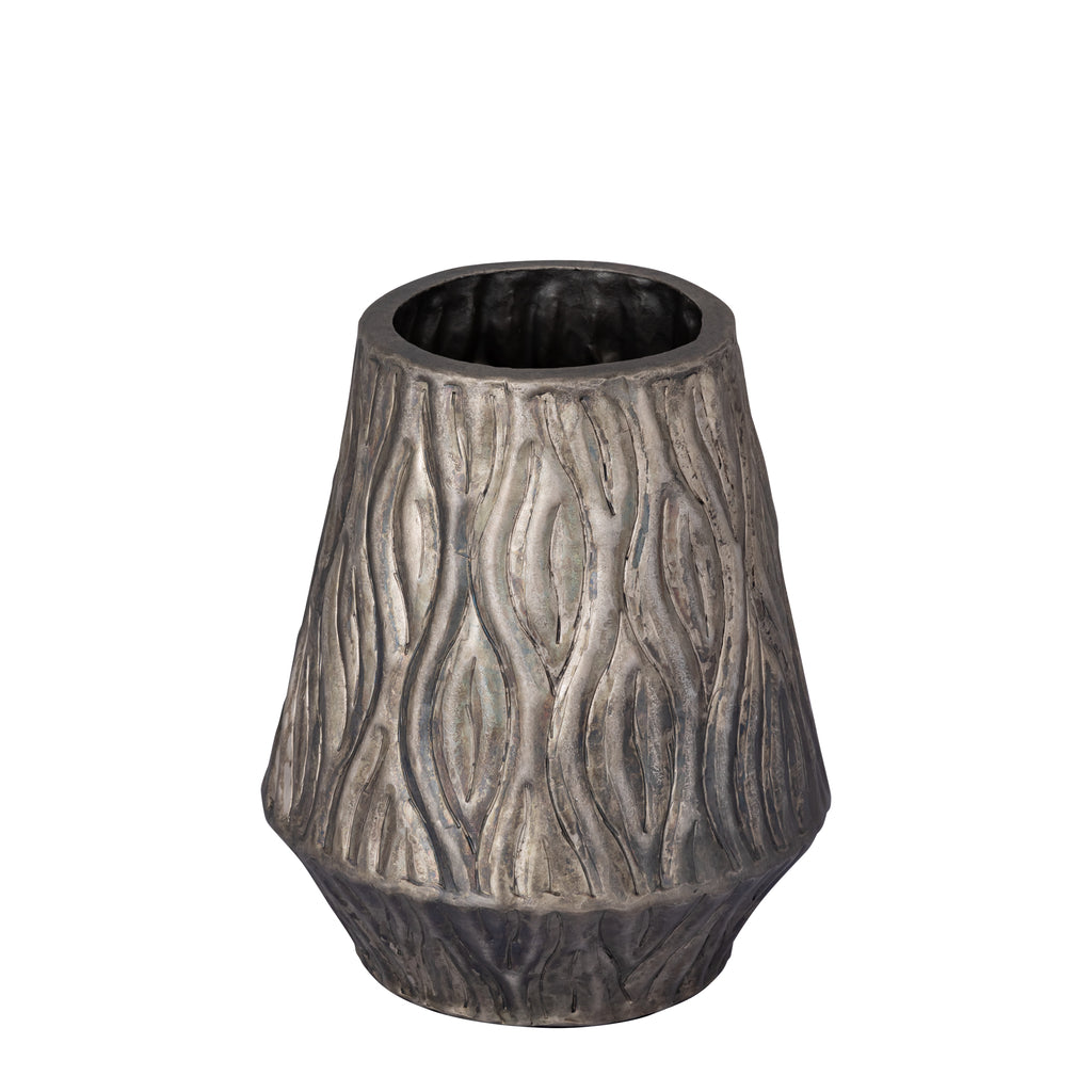 De Vaas Deandra - Laag - M is een elegante aluminium vaas met een golvend patroon, ideaal voor het tonen van bloemen.