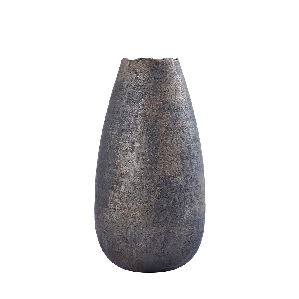 De Vaas Semin - Zilver - M is een middelgrote ronde rustieke pot van zilver met een golvende rand, perfect voor een stijlvolle uitstraling.