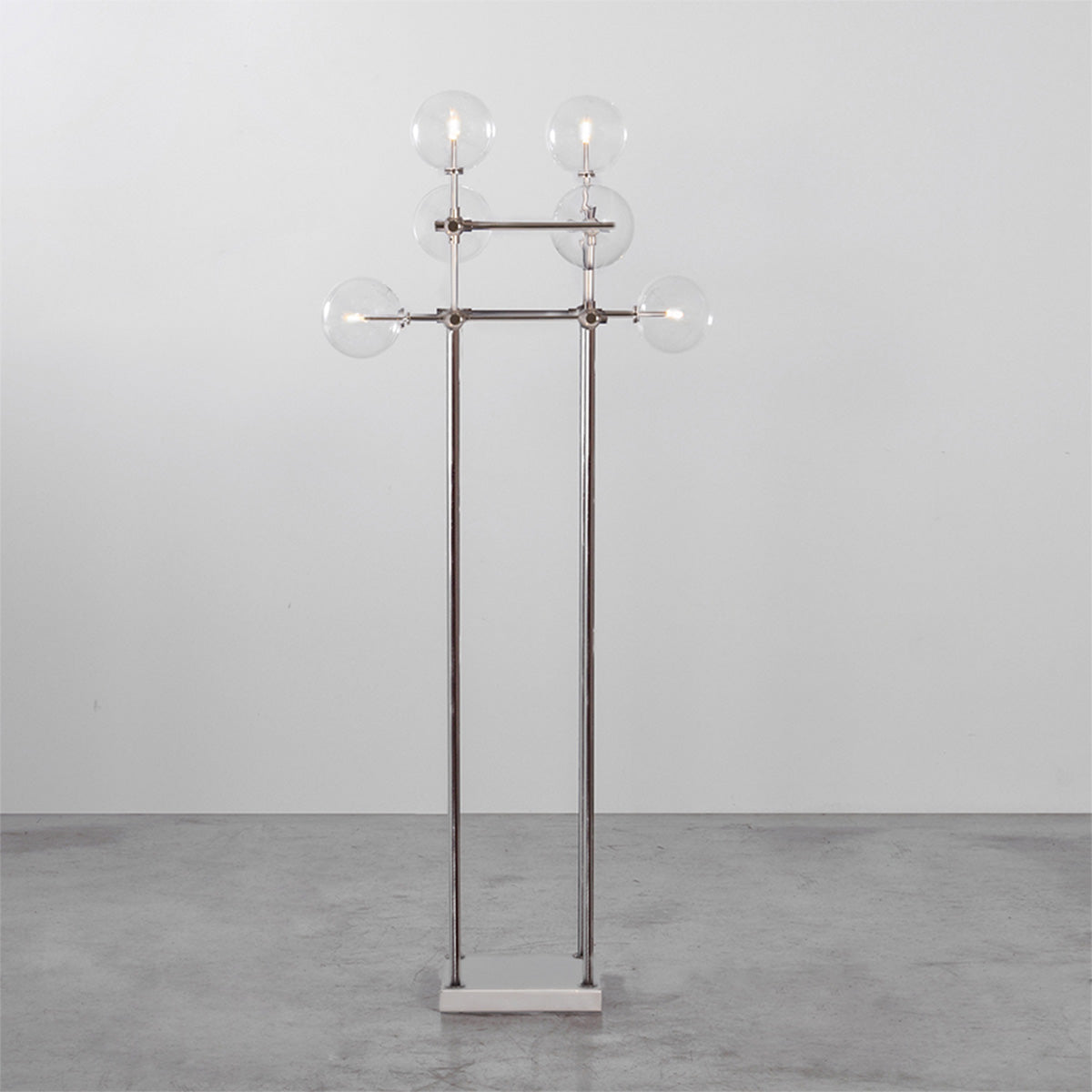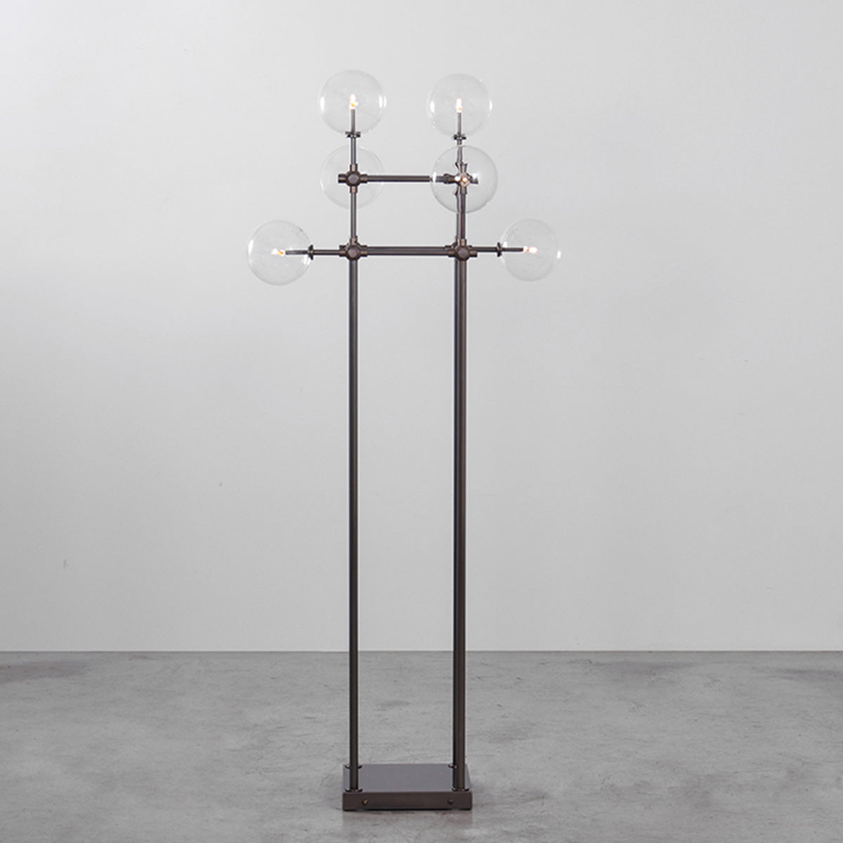 Een reeks etherische glazen bollen zweeft gewichtloos rond een vrijstaand geometrisch rooster. De mondgeblazen bollen zijn roterend gepositioneerd rond het rechthoekige messing rooster, een ruimtelijk ontwerp dat een architectonische indruk wekt.