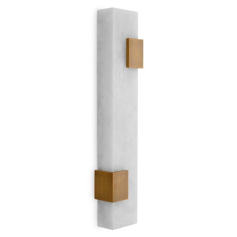 De Furore wandlamp van Eichholtz is een toonbeeld van strakke elegantie en hoogwaardige afwerking. De verticale, rechthoekige vorm in alabaster-look wordt geaccentueerd door twee kubusvormige bevestigingen in vintage brass, die zowel functioneel als decoratief zijn. Het resultaat is een moderne wandlamp met een warme, architectonische uitstraling.