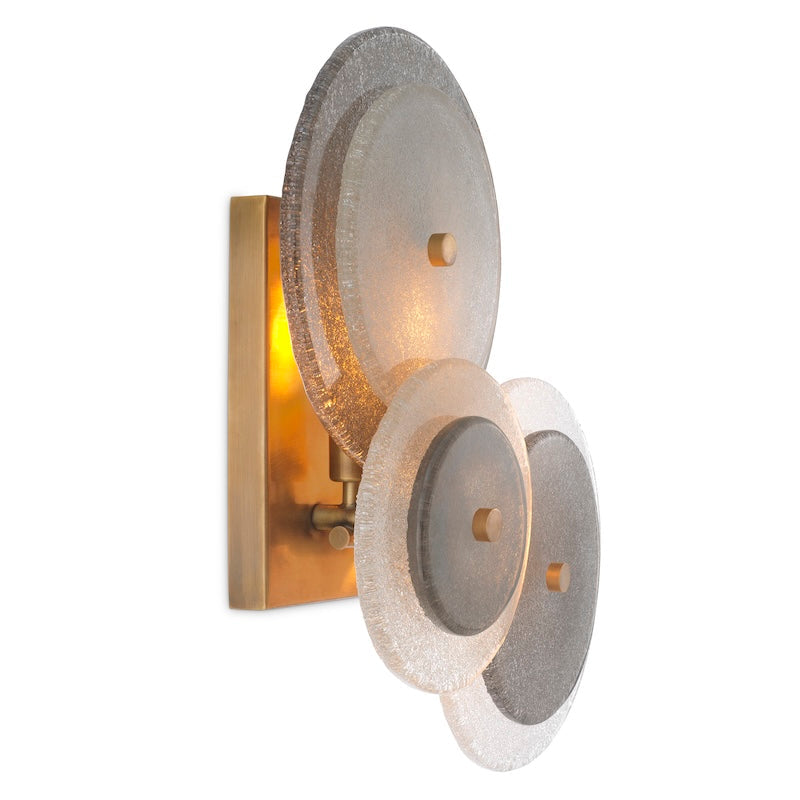 De Hyde wandlamp van Eichholtz is een kunstzinnig en sculpturaal design dat direct de aandacht trekt. Drie ronde schijven van gestructureerd glas in warme grijstinten overlappen elkaar in een speelse compositie, subtiel vastgezet met goudkleurige bevestigingen. De warme gloed van het licht versterkt het spel van texturen en transparantie.